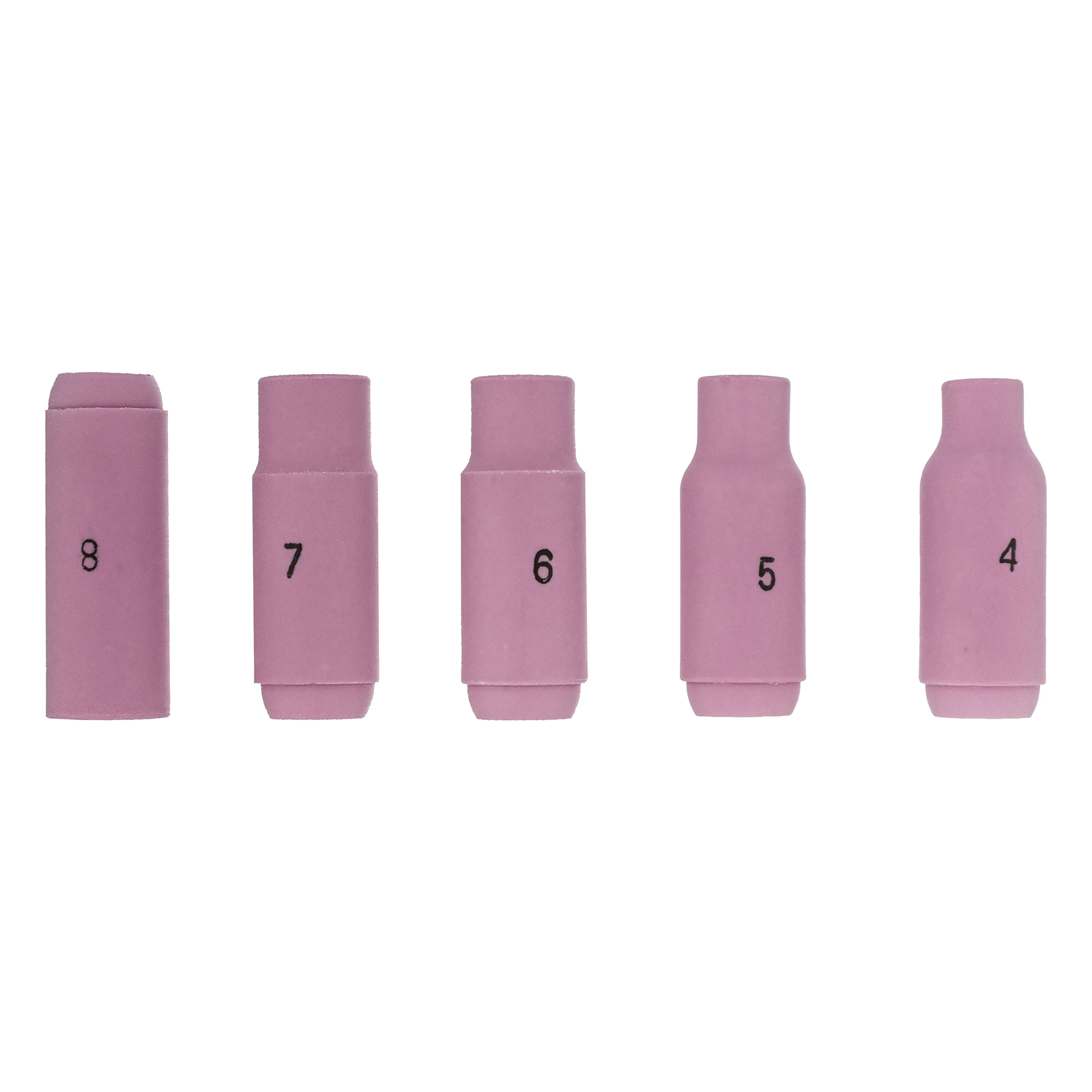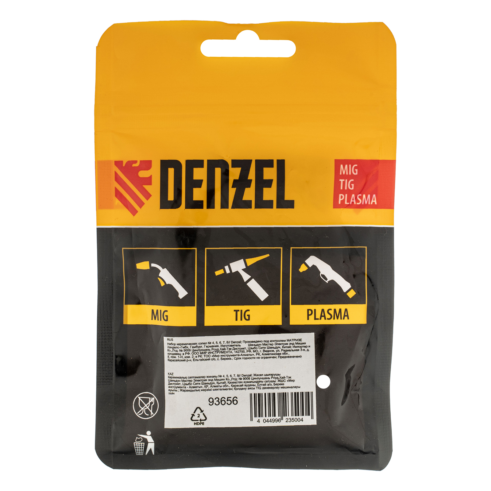 Набор керамических сопел Denzel 93656 включает в себя оснастку № 4, 5, 6, 7, 8, предназначенную для формирования потока защитного газа во время проведения сварочных работ. Предотвращает поступление кислорода к свариваемому материалу и повышает качество сварного шва. Сопла совместимы с TIG-горелками Denzel 93643, 93644, а также с моделями других торговых марок с аналогичным посадочным разъемом.