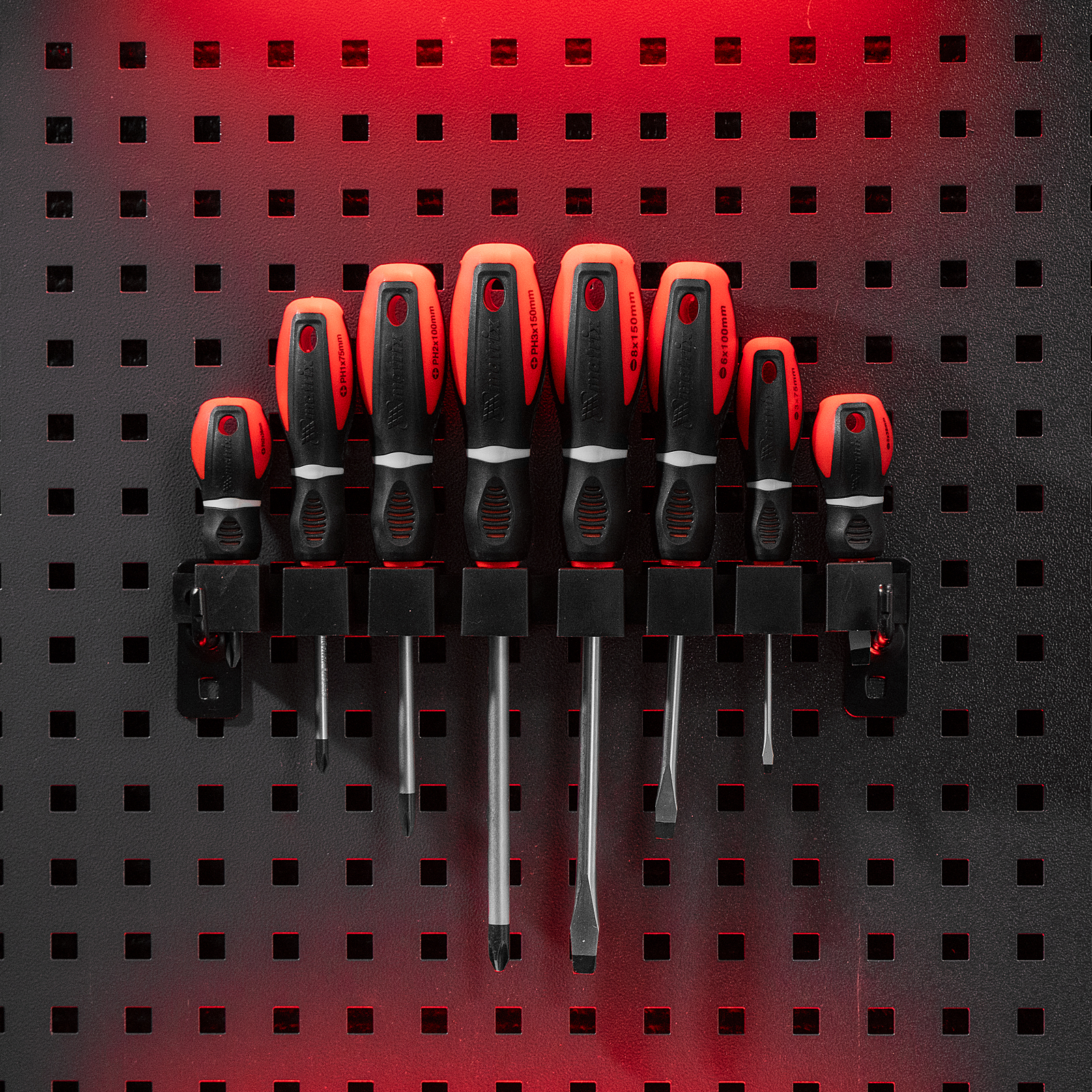 - Удобное хранение — отвертки поставляются в комплекте с пластиковой подвесной полкой.
