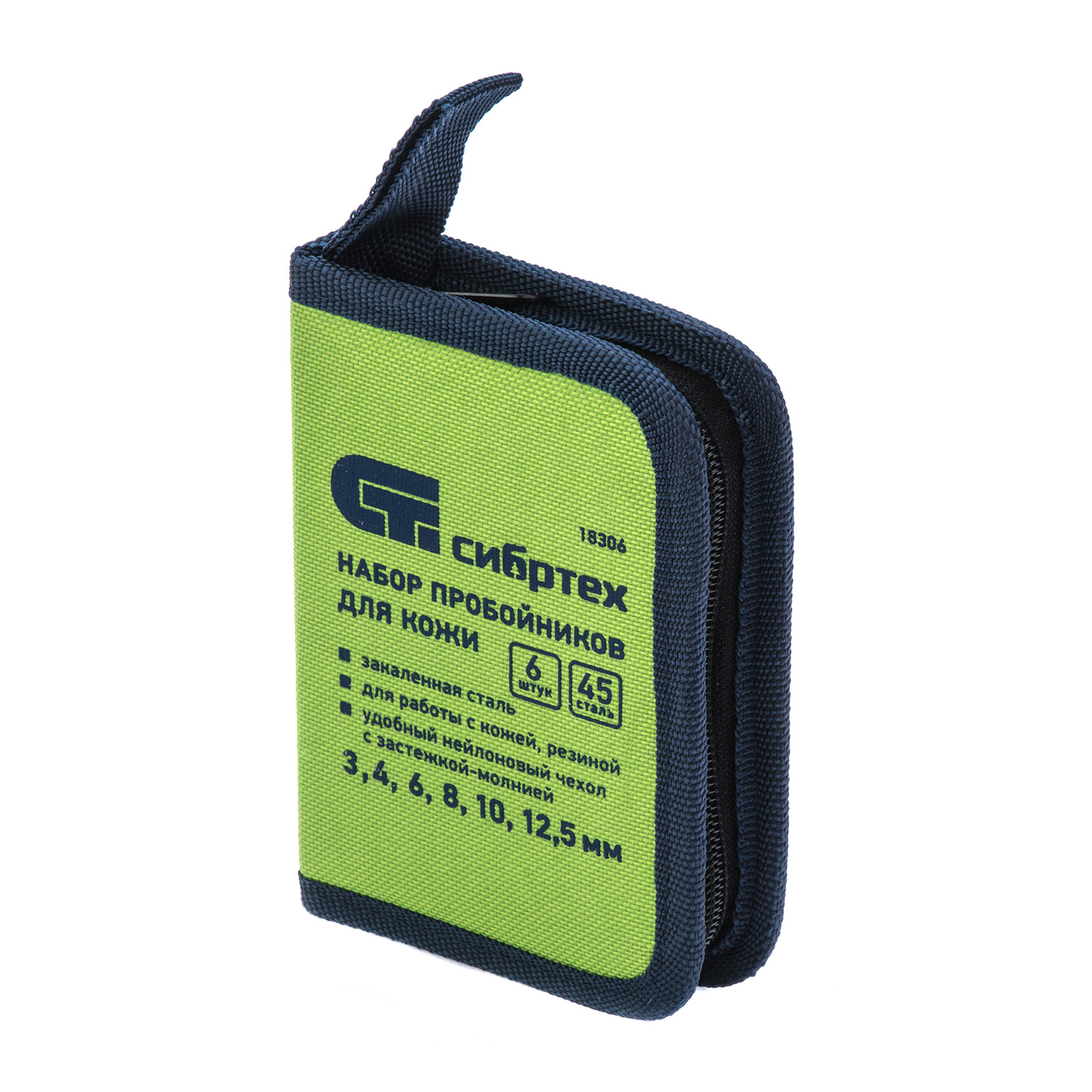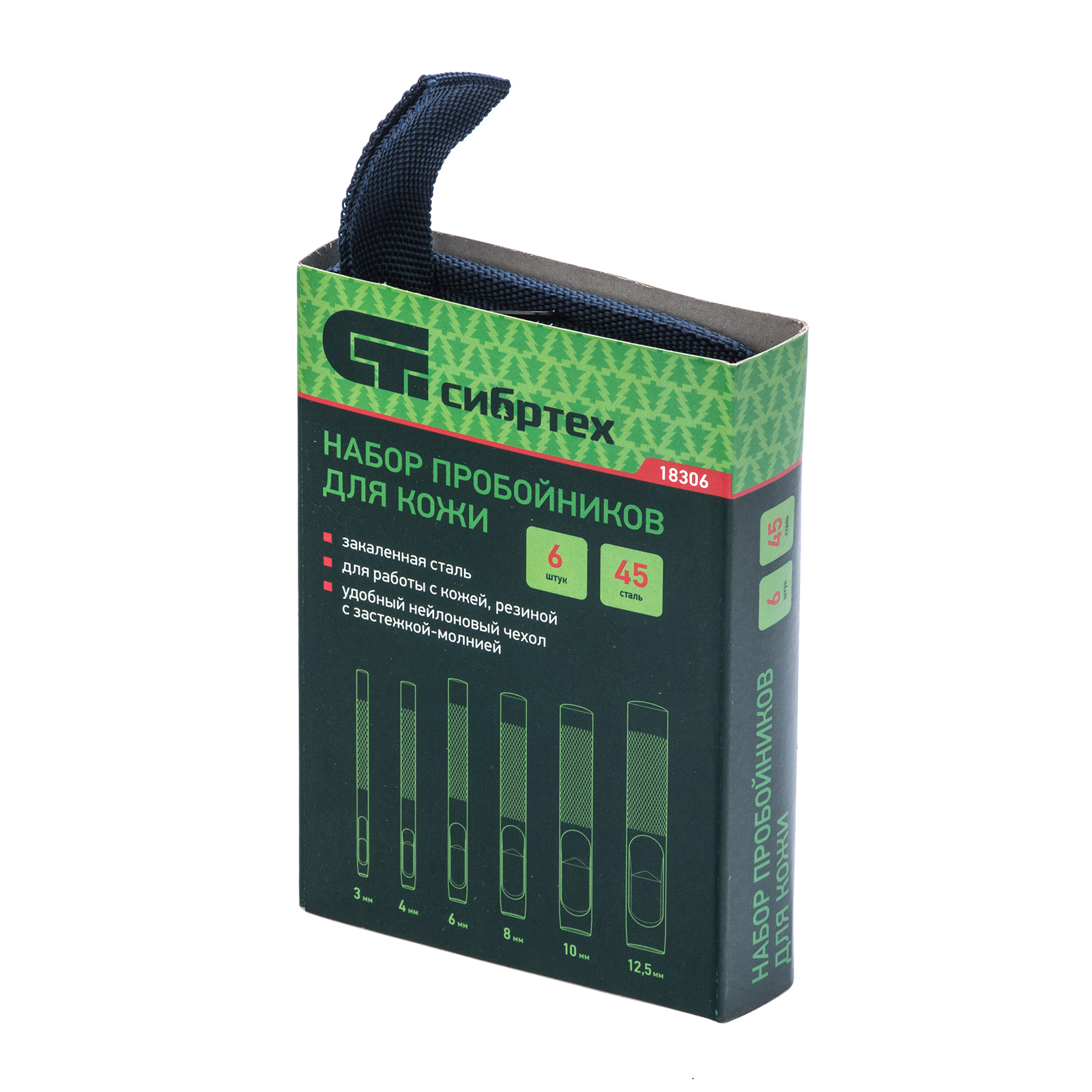 Набор пробойников для кожи Сибртех 18306, 6 шт. в чехле, позволяет пробить отверстия диаметром 3, 4, 6, 8, 10 и 12,5 мм посредством ударного воздействия от киянки. Инструменты предназначены для работы с плотными материалами: кожей и резиной. Благодаря высокоточной прецизионной заточке режущих кромок пробойники выполняют ровный и качественный рез.