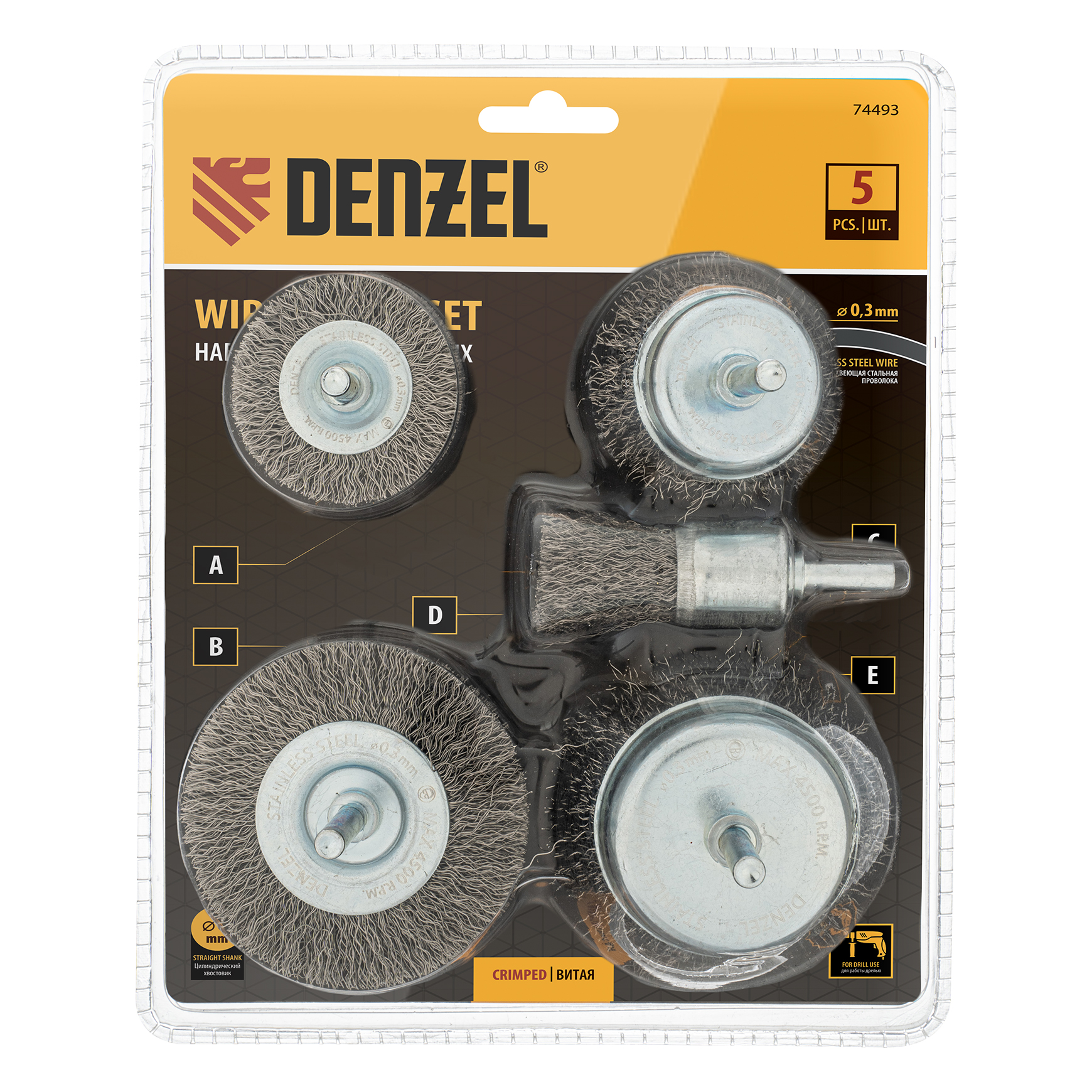 Набор щеток для дрели, 2 Плоские 50-75мм, 3 Чашки 25-50-75мм, шпилька, нерж.вит. проволока Denzel в Челябинске