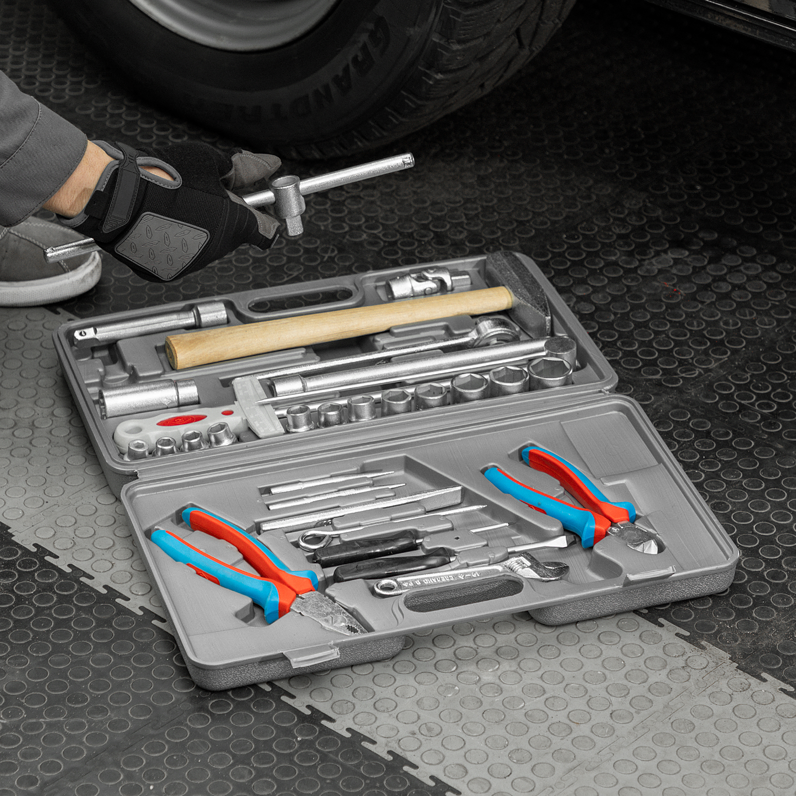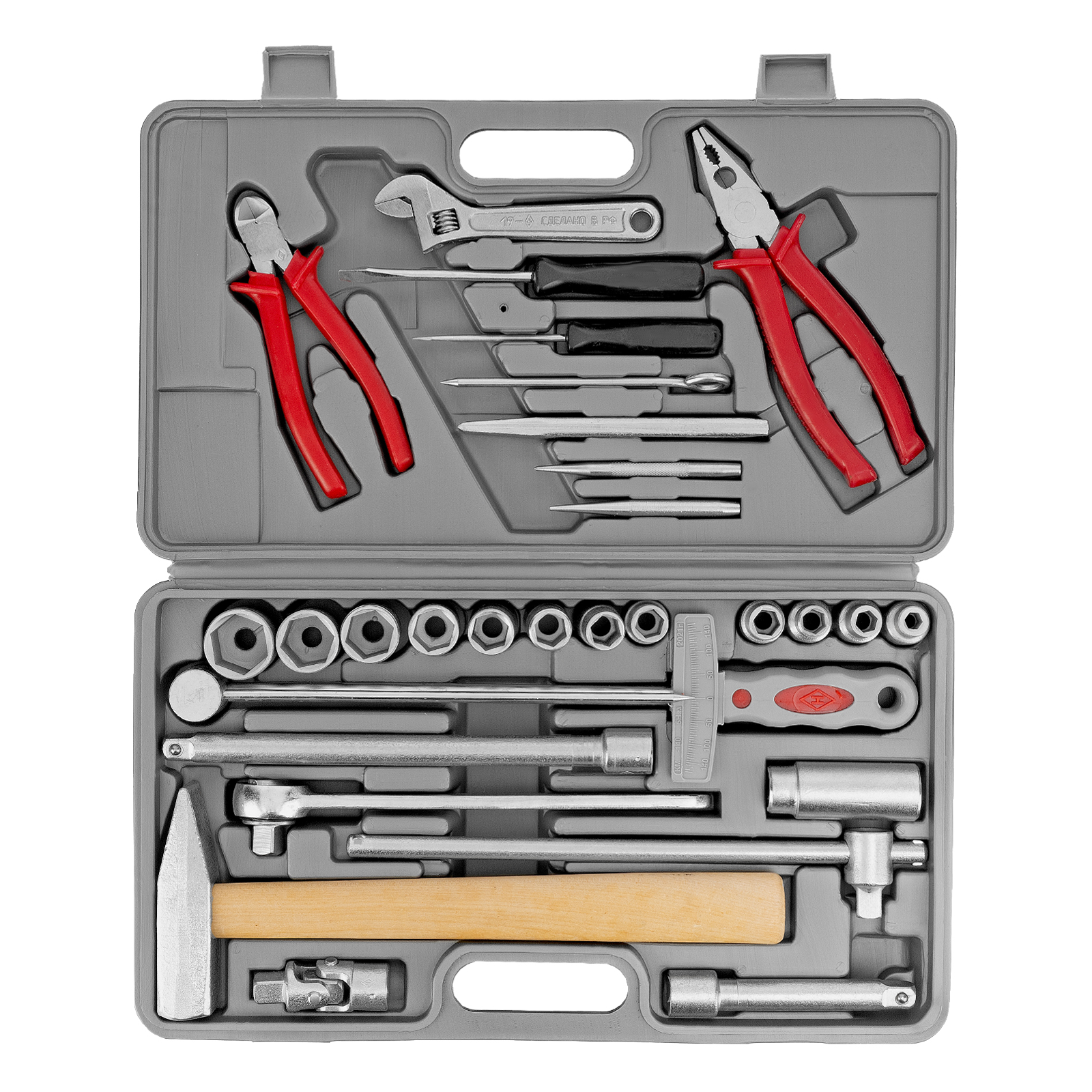 Бокорезы - 1 штПлоскогубцы - 1 штКлюч разводной - 1 штМолоток - 1 штОтвертки - 2 штЧертилка - 1 штКернер - 1 штЗубило - 1 штБородок - 1 штГоловки 8, 10, 11, 12, 1314, 15, 17, 19, 22, 24, 27 - 12 штКлюч динамометрический - 1 штШарнир - 1 штУдлинители 125, 250 - 2 штВороток Т-образный - 1 штКлюч трещотка - 1 штКлюч свечной - 1 штКейс - 1 штМолоток - 1 штПлоскогубцы - 1 штРазводной ключ - 1 штТрещотка - 1 шт |