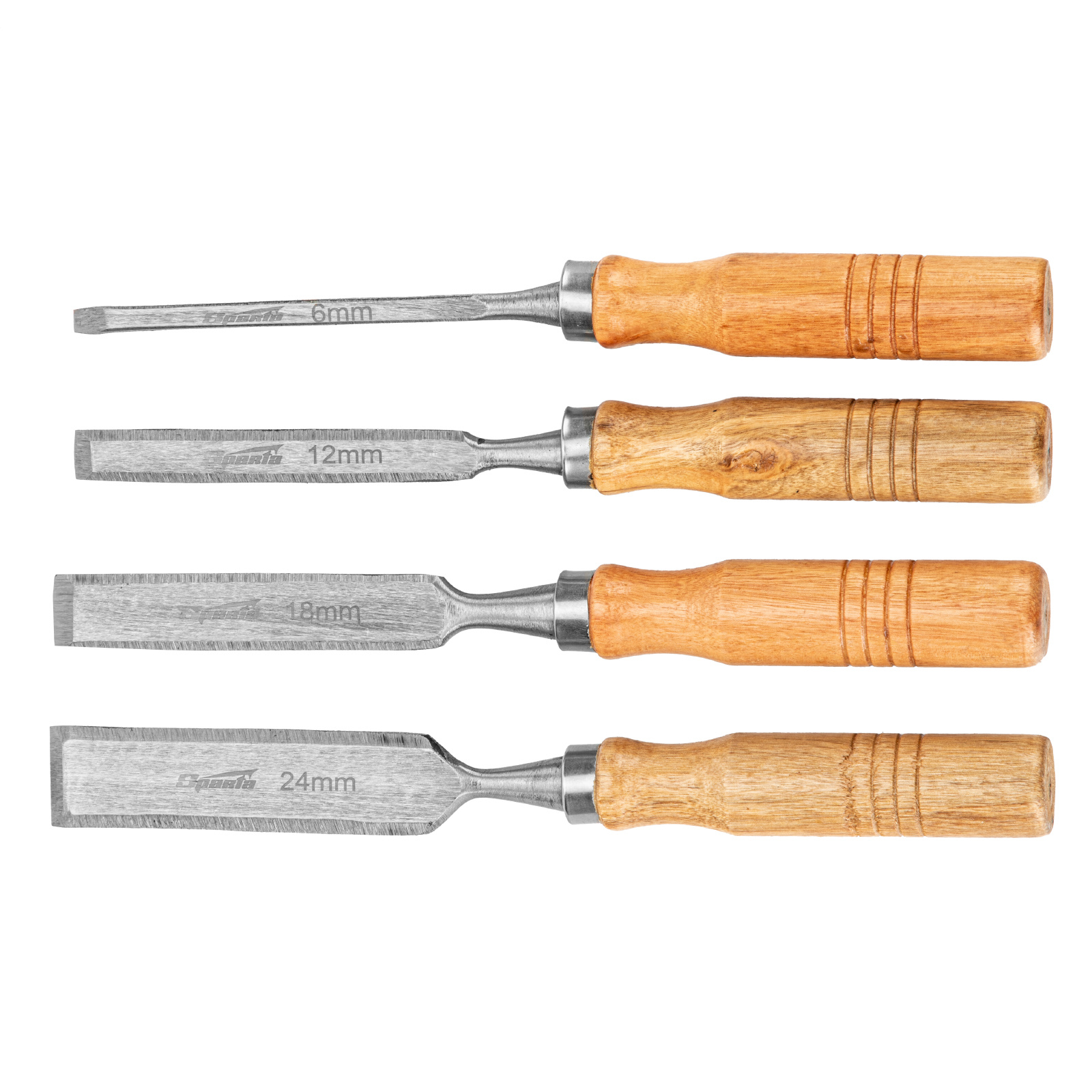 Набор плоских стамесок Sparta 243965 с деревянными рукоятками, с шириной полотен 6, 12, 18 и 24 мм, предназначен для выполнения ручных работ по дереву — зачистки пазов, снятия фасок, вырезания углублений. В комплекте 4 инструмента, что позволяет подобрать оптимальную ширину рабочего полотна. Набор будет полезен столяру, мебельщику и плотнику, а также пригодится дома или на даче.