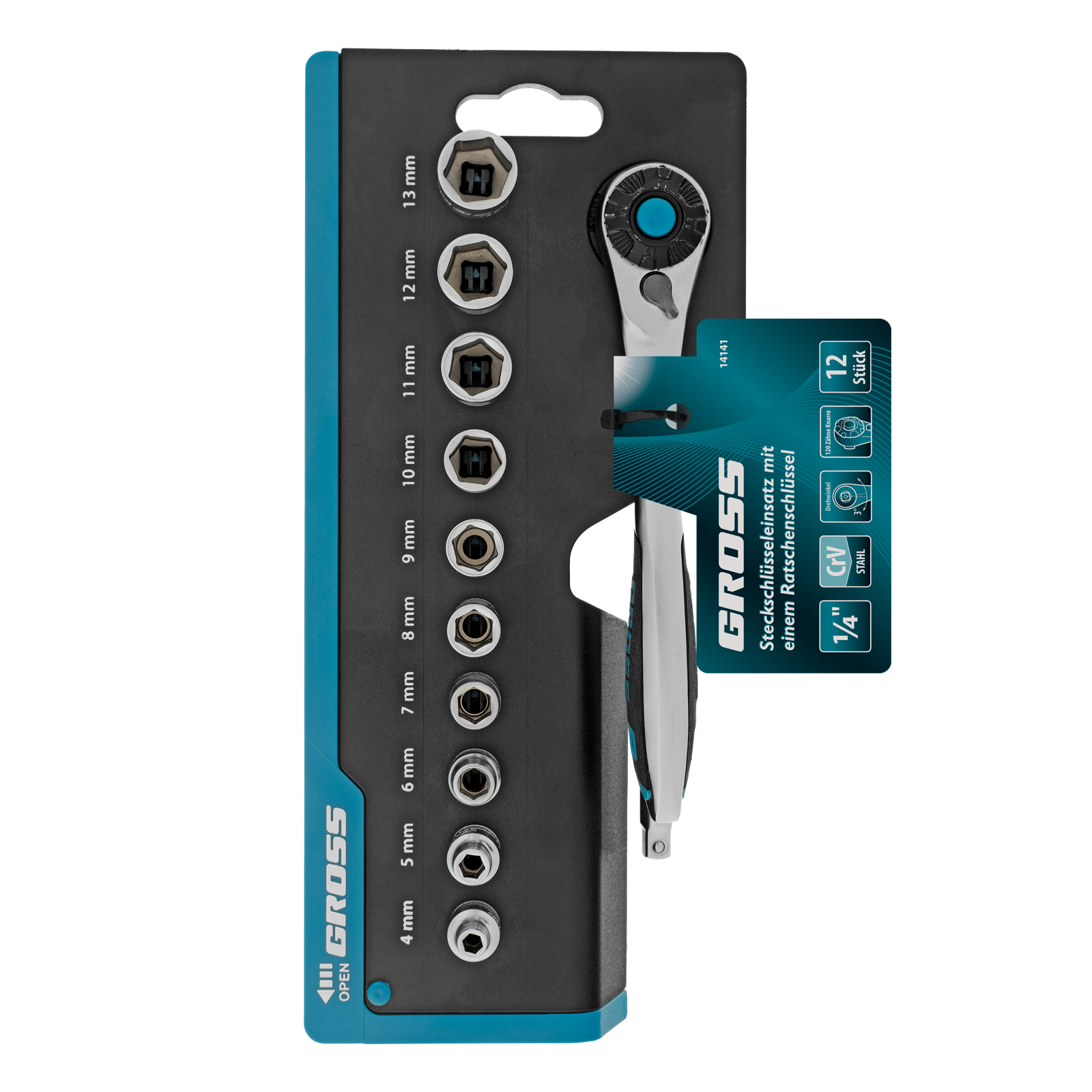 Набор Gross 14141 включает в себя 12 предметов из стали CrV-группы с посадочным квадратом 1/4 дюйма: 10 торцевых головок, трещотку со 120 зубьями и удлинитель 100 мм. Применяется для монтажа и демонтажа резьбовых соединений при проведении технического обслуживания авто или для бытовых ремонтных работ. Набор подходит не только для самостоятельного использования в гараже и дома, но и для профессиональной эксплуатации на станциях техобслуживания.