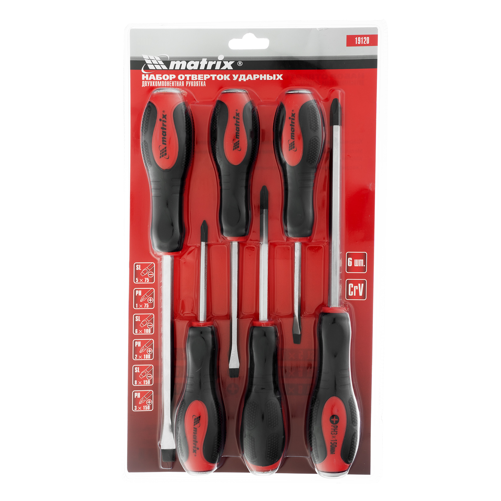 Набор ударных отверток 6 шт, PH1 х 75, PH2 х 100, PH3 х 150, SL5 х 75, SL6 х 100, SL8 х 150, CrV Matrix в Челябинске