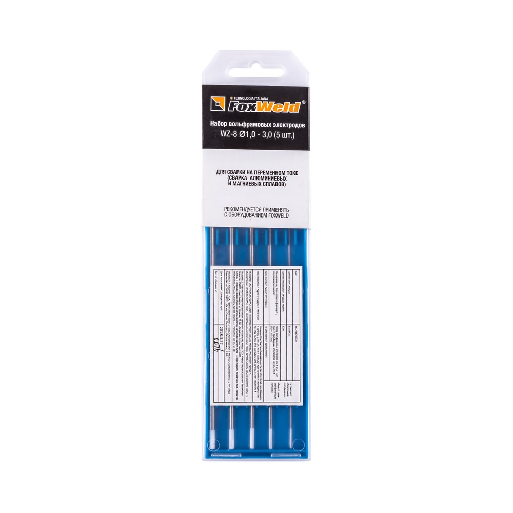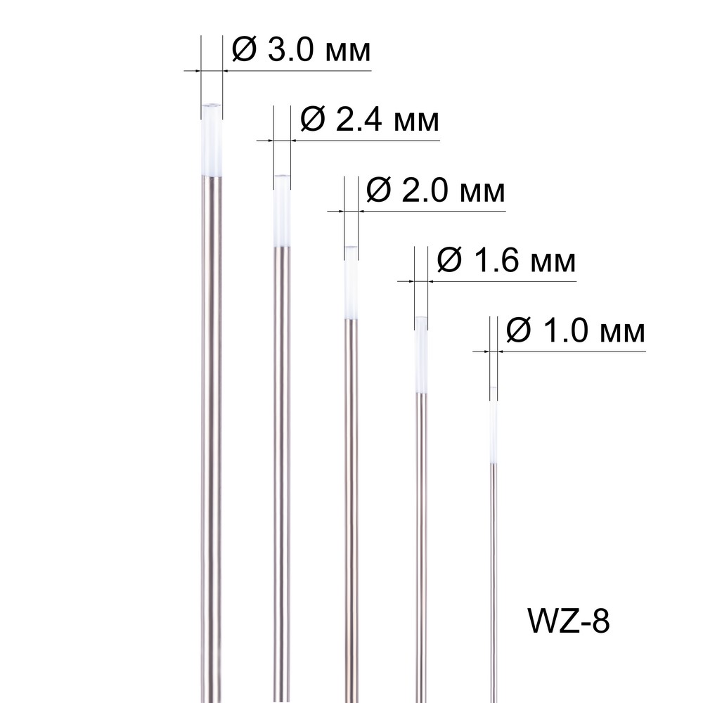 Набор неплавящихся вольфрамовых электродов марки WZ-8 предназначен для аргонодуговой сварки (TIG) на переменном (AC) токе. Электрод легирован оксидом циркония (ZrO₂). Вольфрамовые электроды WZ-8 используются для сварки алюминия, магния и их сплавов. Часто применяются в военно-промышленном комплексе. Электроды этой марки обеспечивают лёгкое зажигание и стабильное горение дуги, хорошо выдерживают высокую токовую нагрузку. Во время сварочного процесса кончик электрода формируют в форме сферы.ПРОЧНАЯ УПАКОВКАВольфрамовые электроды поставляются в специальных пластиковых пеналах. Прочная и жёсткая упаковка выгодно отличается от картонной, т.к. исключает случайную деформацию электродов при доставке и в условиях хранения на складе.ПРЕИМУЩЕСТВА:Набор из 5 электродов разного диаметра (1,0 / 1,6 / 2,0 / 2,4 / 3,0 мм)Сварка алюминия, магния и их сплавовСтабильная дугаВыдерживает большую токовую нагрузкуРабочий наконечник электрода формируется в форме сферыФУНКЦИОНАЛЬНЫЕ ОСОБЕННОСТИ:ПОДБОР ВОЛЬФРАМОВОГО ЭЛЕКТРОДА: Вольфрамовые электроды разделяются по цвету наконечников в зависимости от сферы применения, что необходимо учитывать при выборе.ЗНАЧЕНИЯ ТОКА ДЛЯ ЭЛЕКТРОДОВ РАЗЛИЧНОГО ДИАМЕТРА: * в таблице приведены примерные допустимые значения