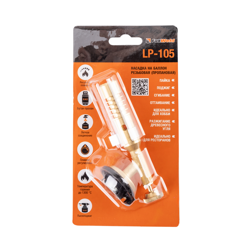 Насадка на баллон без резьбы FOXWELD LP-105 (пропановая) предназначена для пайки твёрдым и мягким припоем, оттаивания, поджига, сгибания и разжигания древесного угля. Насадка оснащена системой безопасности, позволяющей использовать её в наклонном и перевернутом положении от начала и до окончания работ. Это оборудование должно использоваться исключительно с клапанными газовыми баллонами, байонетного типа (в комплект поставки не входит).МНОГОФУНКЦИОНАЛЬНОСТЬ 7-В-1: Насадку на баллон можно применять для пайки твёрдым и мягким припоем, горелка поможет нагреть и отвернуть «прикипевшую» гайку, согнуть металлическую или пластиковую трубу, запаять металл или пластик. Насадка применима и в быту: поможет разжечь мангал и костёр даже сырыми дровами, открыть замёрзший замок, быстро разогреть дымоход дровяной печи или камина для появления тяги. Многофункциональная горелка работает от портативного газового баллончика и оборудована регулятором подачи газа.ПРЕИМУЩЕСТВА:Работает от сменного баллона на жидком газе со стандартным цанговым соединением (пропан-бутановая смесь)Неоценимый помощник в хозяйстве и в дороге, в мастерской и на пикнике, летом и зимойПредназначена для прогрева, плавки и сварки пластиковых частей, нагрева малых металлических частей, плавки металла с низкой температурой плавления, сгибания тонких стеклянных трубокЛёгкое цанговое соединениеПлавная регулировка подачи газаТемпература горения до 1300 °С