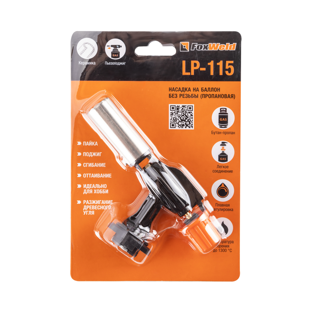 Насадка на баллон без резьбы FOXWELD LP-115 (пропановая) предназначена для пайки твёрдым и мягким припоем, оттаивания, поджига, сгибания и разжигания древесного угля. Насадка оснащена системой безопасности, позволяющей использовать её в наклонном и перевернутом положении от начала и до окончания работ. Это оборудование должно использоваться исключительно с клапанными газовыми баллонами, байонетного типа (в комплект поставки не входит).МНОГОФУНКЦИОНАЛЬНОСТЬ 7-В-1Насадку на баллон можно применять для пайки твёрдым и мягким припоем, горелка поможет нагреть и отвернуть «прикипевшую» гайку, согнуть металлическую или пластиковую трубу, запаять металл или пластик. Насадка применима и в быту: поможет разжечь мангал и костёр даже сырыми дровами, открыть замёрзший замок, быстро разогреть дымоход дровяной печи или камина для появления тяги. Многофункциональная горелка работает от портативного газового баллончика и оборудована регулятором подачи газа.ПРЕИМУЩЕСТВА:Работает от сменного баллона на жидком газе со стандартным цанговым соединением (пропан-бутановая смесь)Неоценимый помощник в хозяйстве и в дороге, в мастерской и на пикнике, летом и зимойПредназначена для прогрева, плавки и сварки пластиковых частей, нагрева малых металлических частей, плавки металла с низкой температурой плавления, сгибания тонких стеклянных трубокЛёгкое цанговое соединениеПлавная регулировка подачи газаТемпература горения до 1300 °СПьезоподжиг
