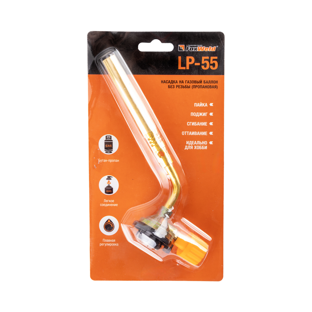 Насадка на баллон без резьбы FOXWELD LP-55 (пропановая) предназначена для пайки твёрдым и мягким припоем, оттаивания, поджига, сгибания и разжигания древесного угля. Лампа LP-55 (пропановая) работает на газе и легко соединяется и разъединяется со сменным газовым баллоном. Модель удобна и для выполнения профессиональных задач, и для хобби.МНОГОФУНКЦИОНАЛЬНОСТЬ 7-В-1Насадку на баллон можно применять для пайки твёрдым и мягким припоем, горелка поможет нагреть и отвернуть «прикипевшую» гайку, согнуть металлическую или пластиковую трубу, запаять металл или пластик. Насадка применима и в быту: поможет разжечь мангал и костёр даже сырыми дровами, открыть замёрзший замок, быстро разогреть дымоход дровяной печи или камина для появления тяги. Многофункциональная горелка работает от портативного газового баллончика и оборудована регулятором подачи газа.ПРЕИМУЩЕСТВА:Работает от сменного баллона на жидком газе со стандартным цанговым соединением (пропан-бутановая смесь)Неоценимый помощник в хозяйстве и в дороге, в мастерской и на пикнике, летом и зимойПредназначена для прогрева, плавки и сварки пластиковых частей, нагрева малых металлических частей, плавки металла с низкой температурой плавления, сгибания тонких стеклянных трубокЛёгкое цанговое соединениеПлавная регулировка подачи газаТемпература горения до 1300 °С