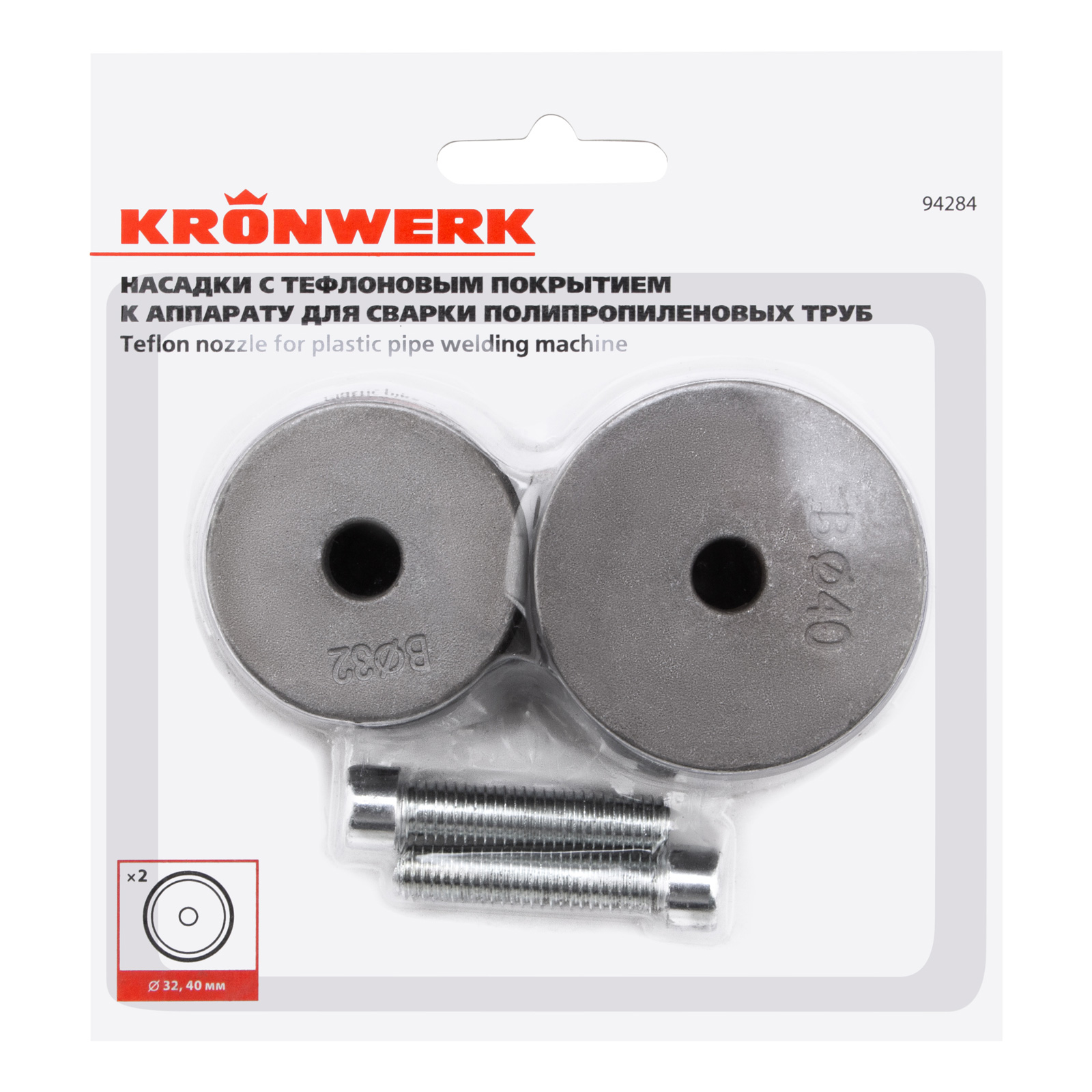 Насадки с тефлоновым покрытием Kronwerk 94284 диаметром 32 и 40 мм подходят к любому аппарату для сварки полипропиленовых труб. Каждая насадка состоит из 2 частей: одна для трубы и одна для фитинга. Набор пригодится для монтажа и ремонта систем водопровода.
