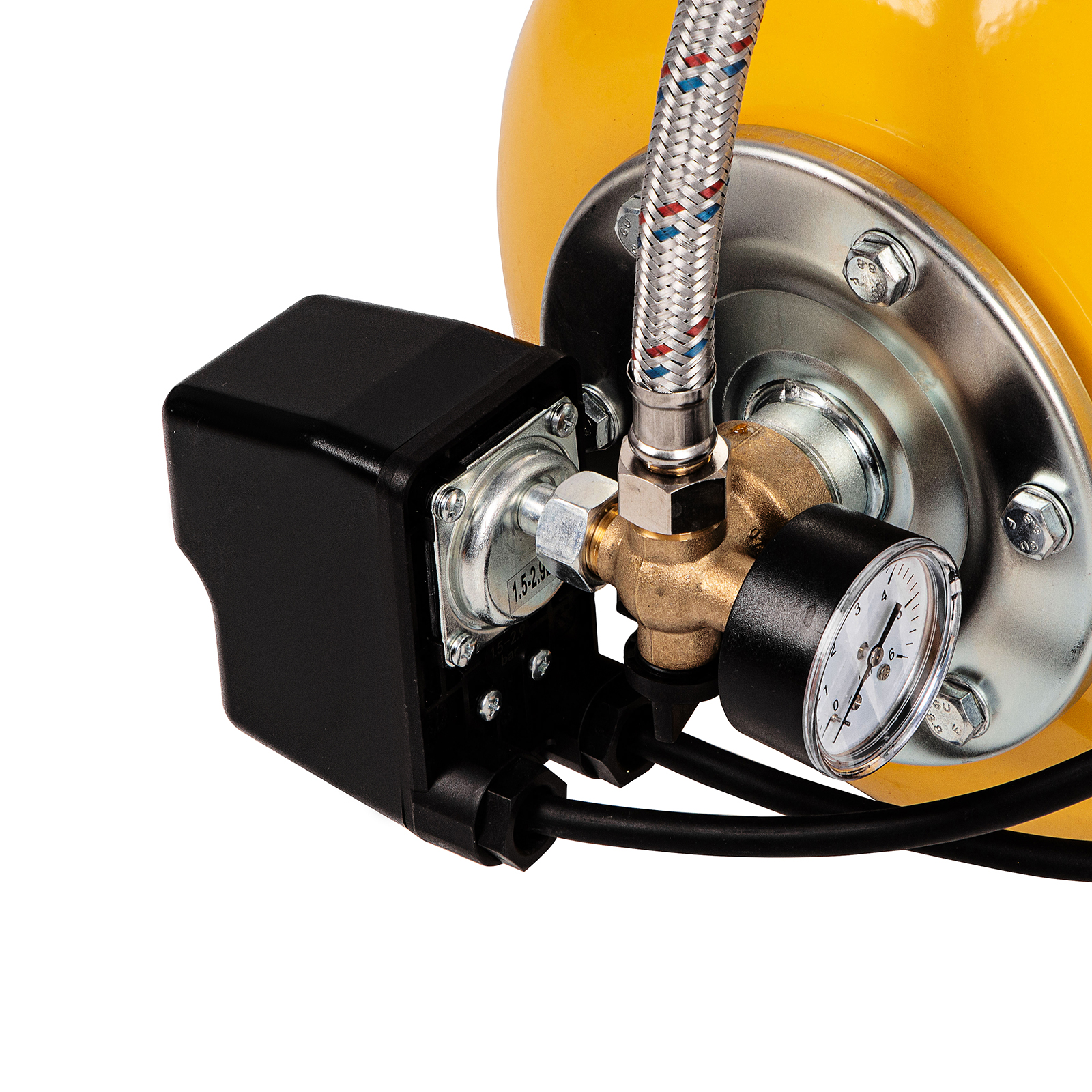 - Автоматизация работы — реле контролирует работу насоса в диапазоне 1,5–3 бар, отключая двигатель при превышении и запуская при понижении давления, это обеспечивает сохранность системы и экономное энергопотребление.