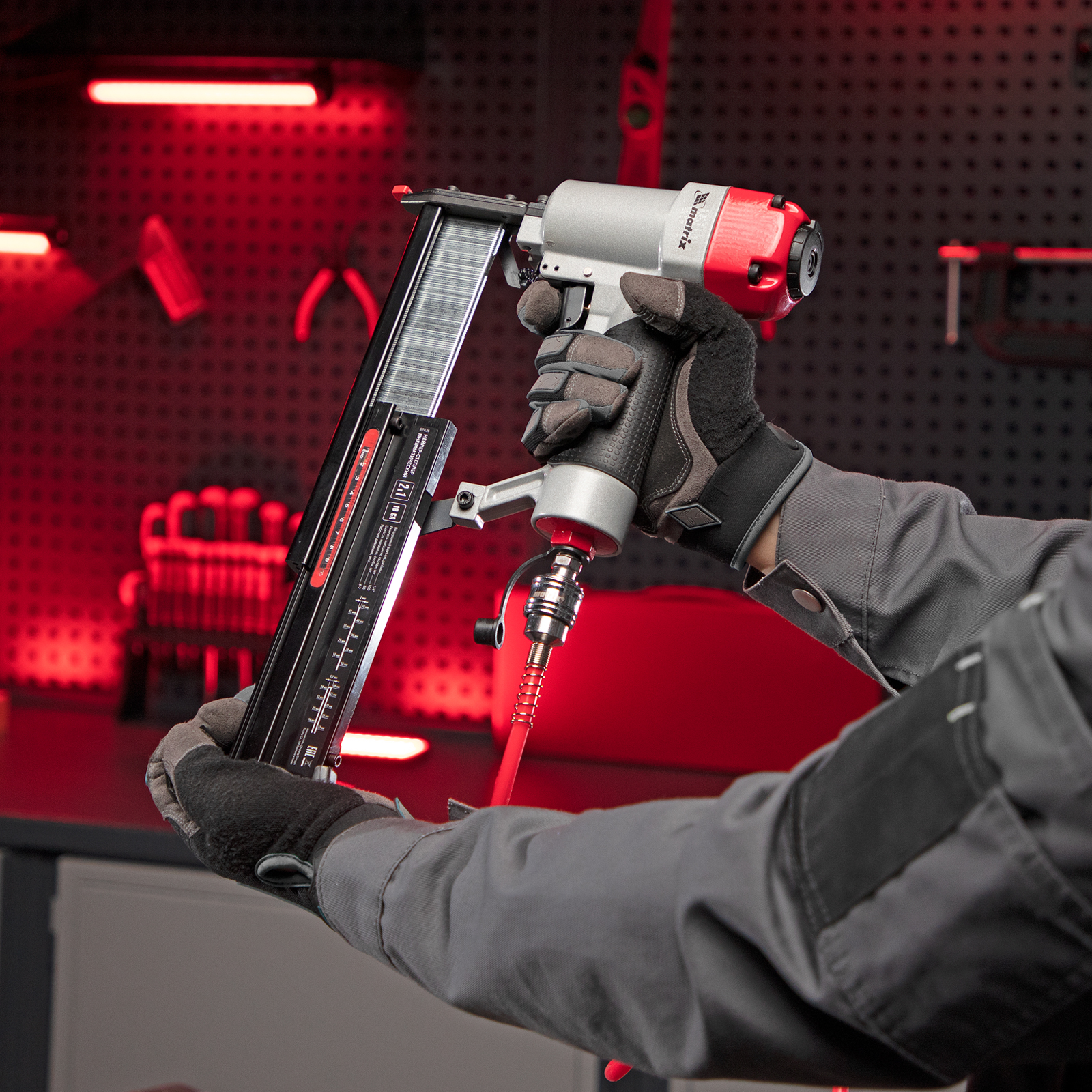 - Эргономичность — благодаря прорезиненному покрытию рукоятки и малому весу 1,5 кг нейлером-степлером можно долго работать без усталости.