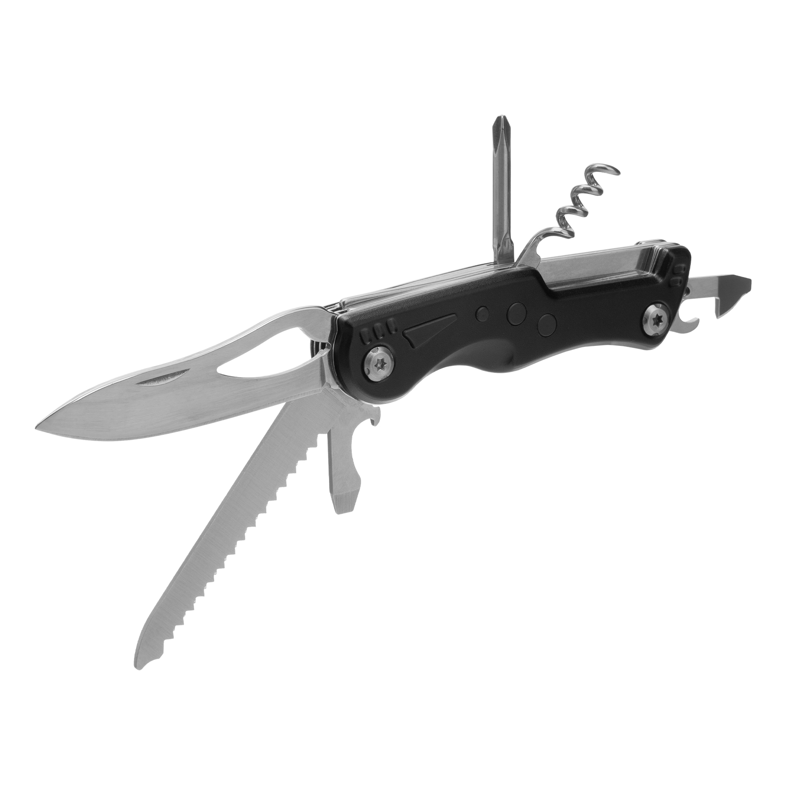 Многофункциональный нож Matrix 17624 длиной 107 мм имеет 7 функций и поставляется с чехлом. Способен резать картон и другие материалы, откручивать и закручивать резьбовой крепеж, открывать бутылки и консервные банки. Складной нож будет полезен дома, на даче, на пикнике, охоте или рыбалке, также пригодится в гараже.