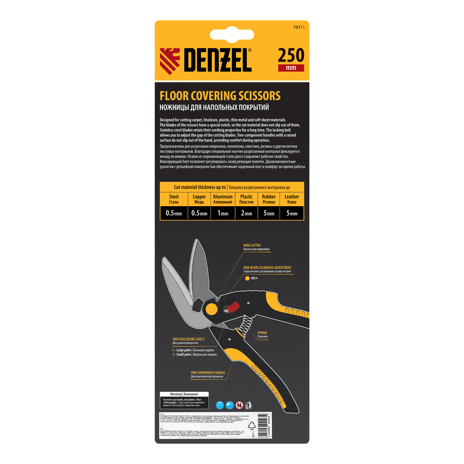 Ножницы для резки напольных покрытий Denzel 78311 длиной 250 мм, с лезвиями из нержавеющей стали и функцией перерезания проволоки/проводов, — инструмент для раскройки ковролина, линолеума, пластика, резины и других мягких материалов. Размер лезвий позволяет выполнять длинный прямой рез. Одно из лезвий имеет серрейторную (зубчатую) заточку, поэтому разрезаемый материал не выскальзывает из инструмента. Ножницы пригодятся при проведении отделочных работ.
