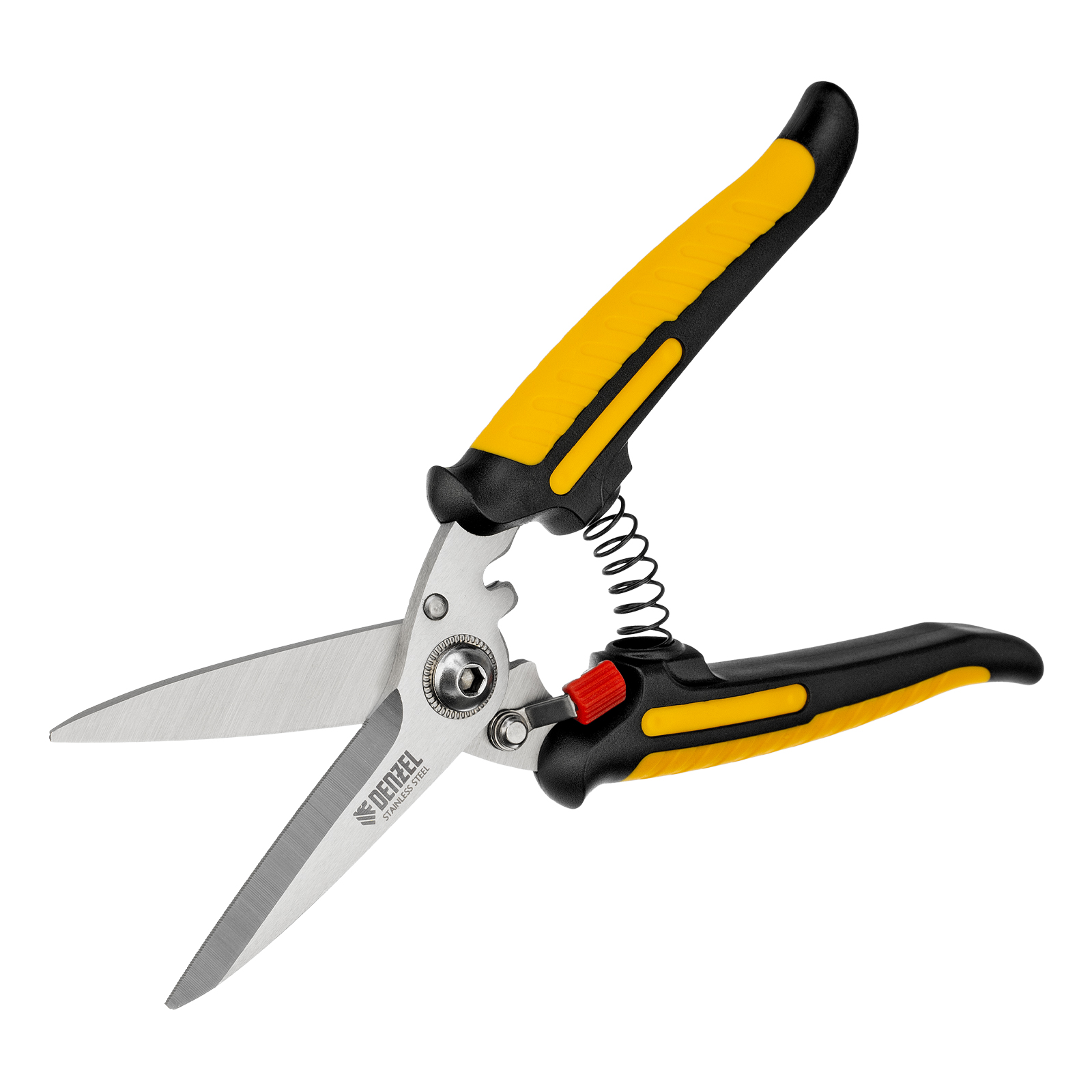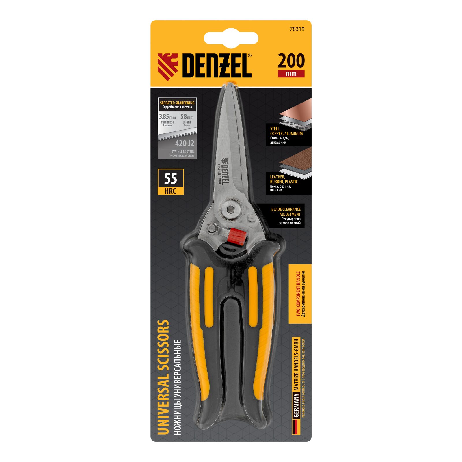 Универсальные ножницы Denzel 78319 длиной 200 мм — инструмент для разрезания тонкого металла и мягких материалов. Одно из лезвий имеет серрейторную (зубчатую) заточку, поэтому разрезаемый материал не выскальзывает из инструмента. Ножницы подходят для выполнения разнообразных работ: на даче помогут разрезать стальную сетку с небольшим диаметром проволоки, в походе — ветки или рыбу, во время мелкого ремонта или занятий творчеством — провода, кожу, резину, картон, бумажную лозу и другие материалы.