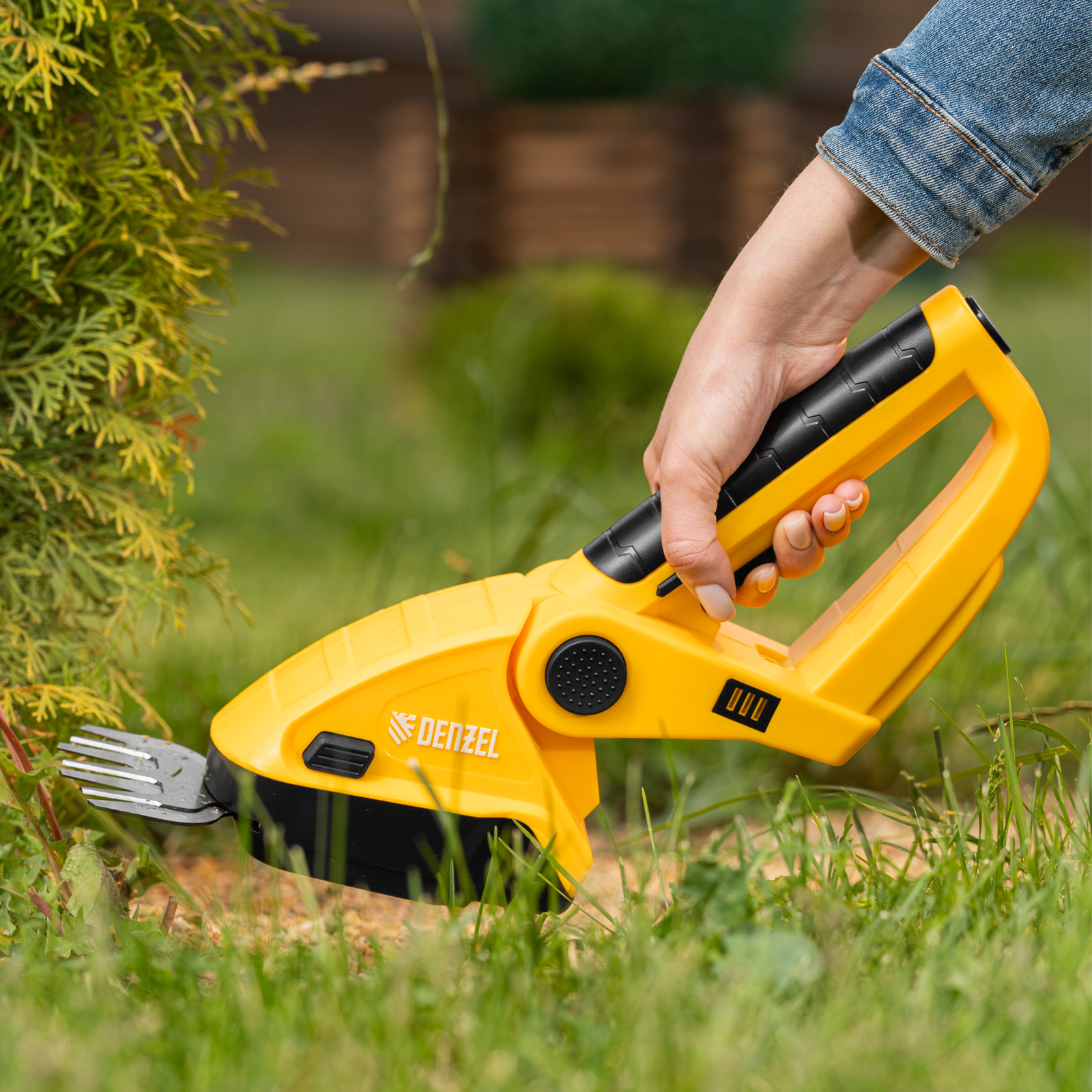 Аккумуляторные ножницы-кусторез Denzel GS-7 59428 предназначены для срезания травы, обрезки кустов и веток диаметром до 8 мм, подходят также для ухода за живой изгородью. Ширина среза в режиме ножниц составляет 80 мм, в режиме кустореза — 120 мм, что позволяет эффективно решать поставленные задачи. Инструмент работает от аккумулятора Li-Ion номинальным напряжением 7,2 В и емкостью 1,5 А·ч, не требует подключения к стационарному источнику питания и может использоваться на любом расстоянии от дома. Пригодится владельцам дачных участков.