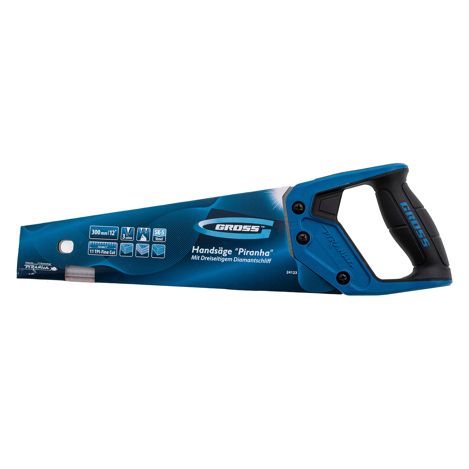 Ножовка по дереву Gross PIRANHA 24123 с полотном длиной 300 мм, калеными зубьями с 3D-заточкой и шагом 11 TPI, с 2-компонентной рукояткой, предназначена для распиловки заготовок из древесины, ДСП, ДВП, МДФ и ламината, а также из пластических материалов, таких как пенополистирол и полиуретан. Может производить продольный и поперечный распил. Мелкие зубья с шагом 11 TPI позволяют выполнять точный и чистый рез. Ножовка обладает высокой производительностью благодаря трехгранной заточке зубьев. Инструмент используется в столярном деле.
