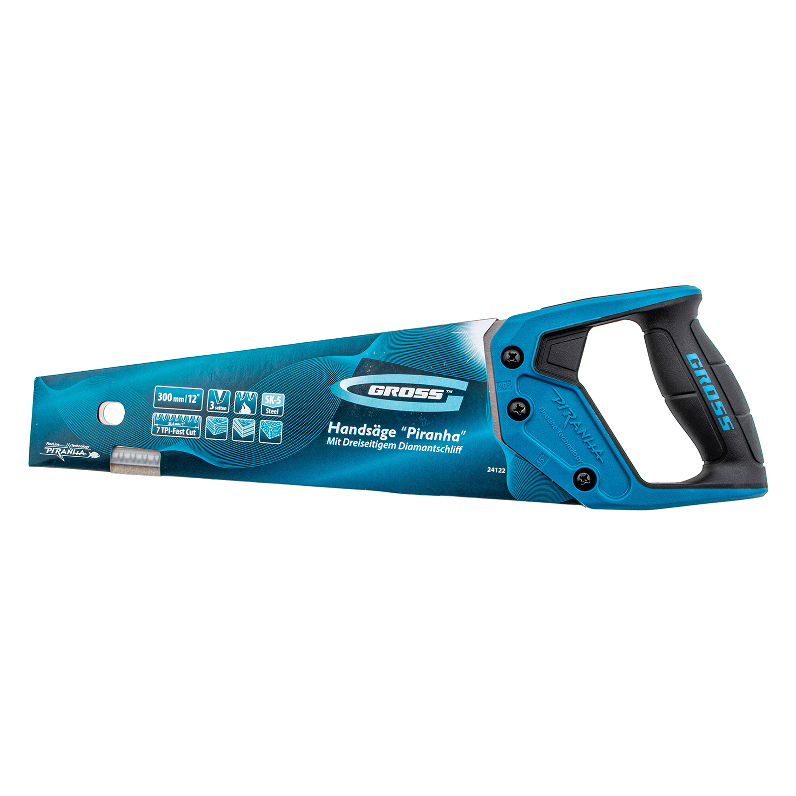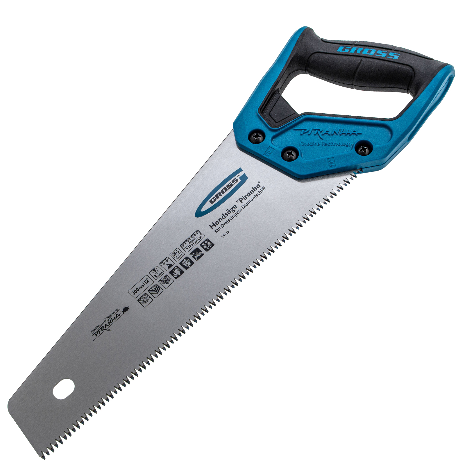 Ножовка по дереву Gross PIRANHA 24122 с полотном длиной 300 мм, калеными зубьями с 3D-заточкой и шагом 7 TPI, с 2-компонентной рукояткой, используется для распиливания древесины, МДФ, ДСП, ДВП, ламината, а также пенополистирола, полиуретана и других пластических материалов. Подходит для продольного и поперечного пиления. Зубья имеют универсальный шаг 7 TPI, поэтому ножовка подходит для решения широкого спектра задач. Трехгранная заточка зубьев обеспечивает максимальную производительность и высокое качество пиления. Ножовка предназначена для столярных и плотницких работ, пригодится во время ремонта и будет полезна в быту.