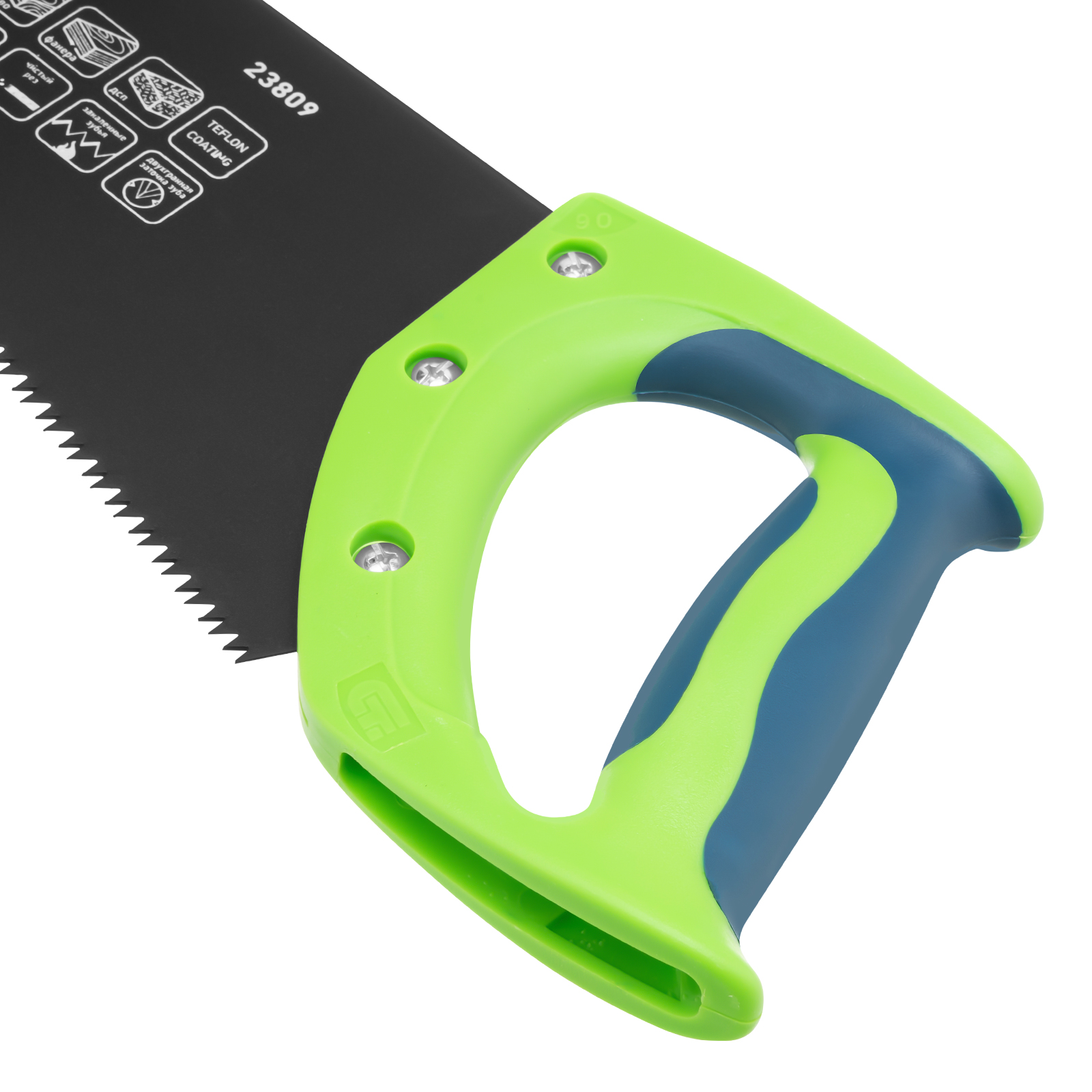 Ножовка по дереву Сибртех «Зубец» 23809 с полотном длиной 350 мм, с калеными зубьями с 2D-заточкой и шагом 7-8 TPI, с защитным покрытием и двухкомпонентной рукояткой, используется для продольного и поперечного распила заготовок из древесины, фанеры и ДСП. Подходит для двустороннего реза. Зубья с универсальным шагом 7-8 TPI обеспечивают оптимальную скорость и качество распиловки. Если режущая кромка затупится, ее можно будет заточить. Ножовка будет полезна в столярной мастерской, а также дома или на даче.