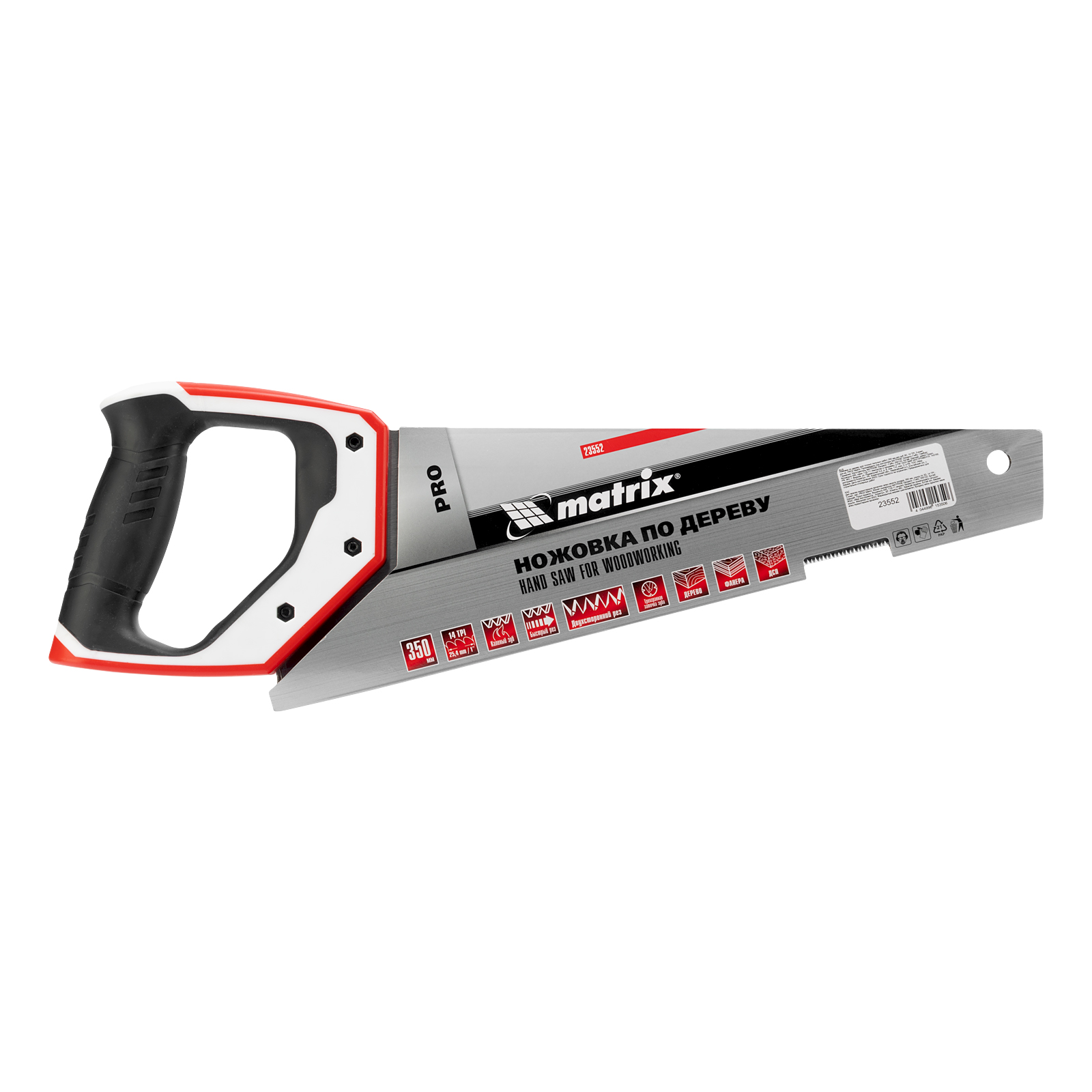 Ножовка по дереву Matrix PRO 23552 с полотном длиной 350 мм, калеными зубьями с шагом 14 TPI и 3D-заточкой, с трехкомпонентной рукояткой, предназначена для точных пильных работ с заготовками из древесины, фанеры и ДСП. Подходит для продольного и поперечного пиления. Шаг зубьев составляет 14 TPI, что обеспечивает точность реза. 3D-заточка зубьев увеличивает производительность ножовки. Инструмент будет полезен в столярной мастерской, а также пригодится в быту.