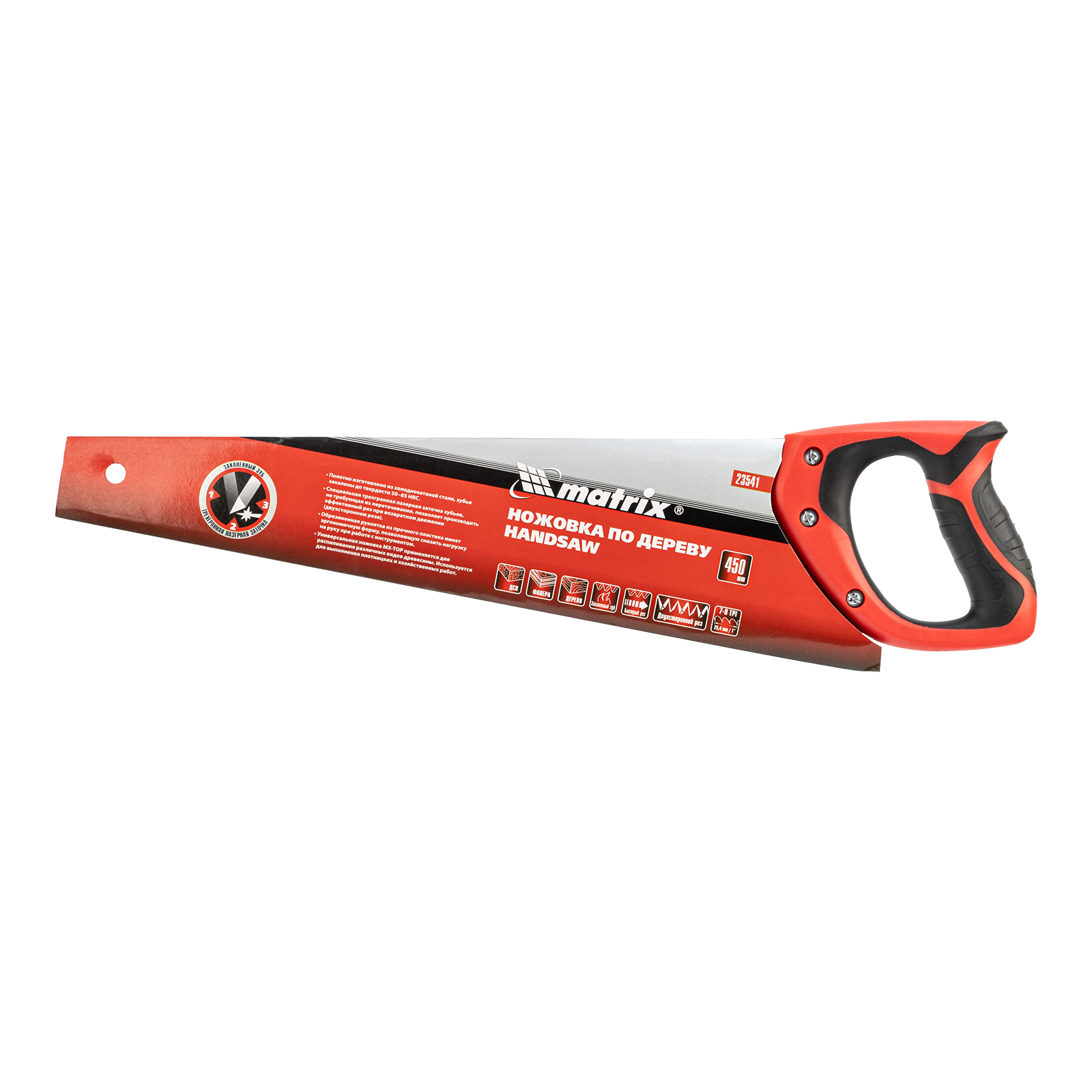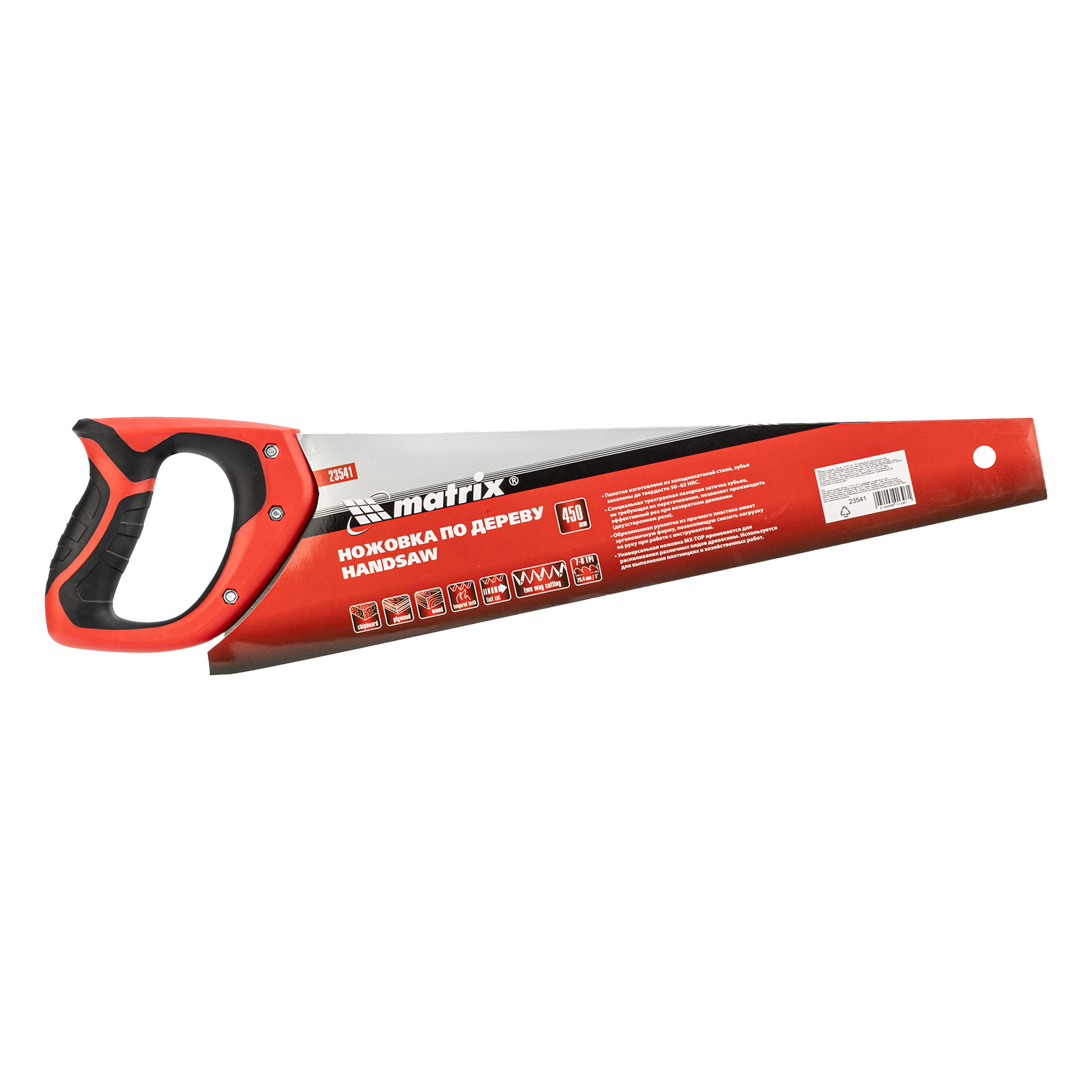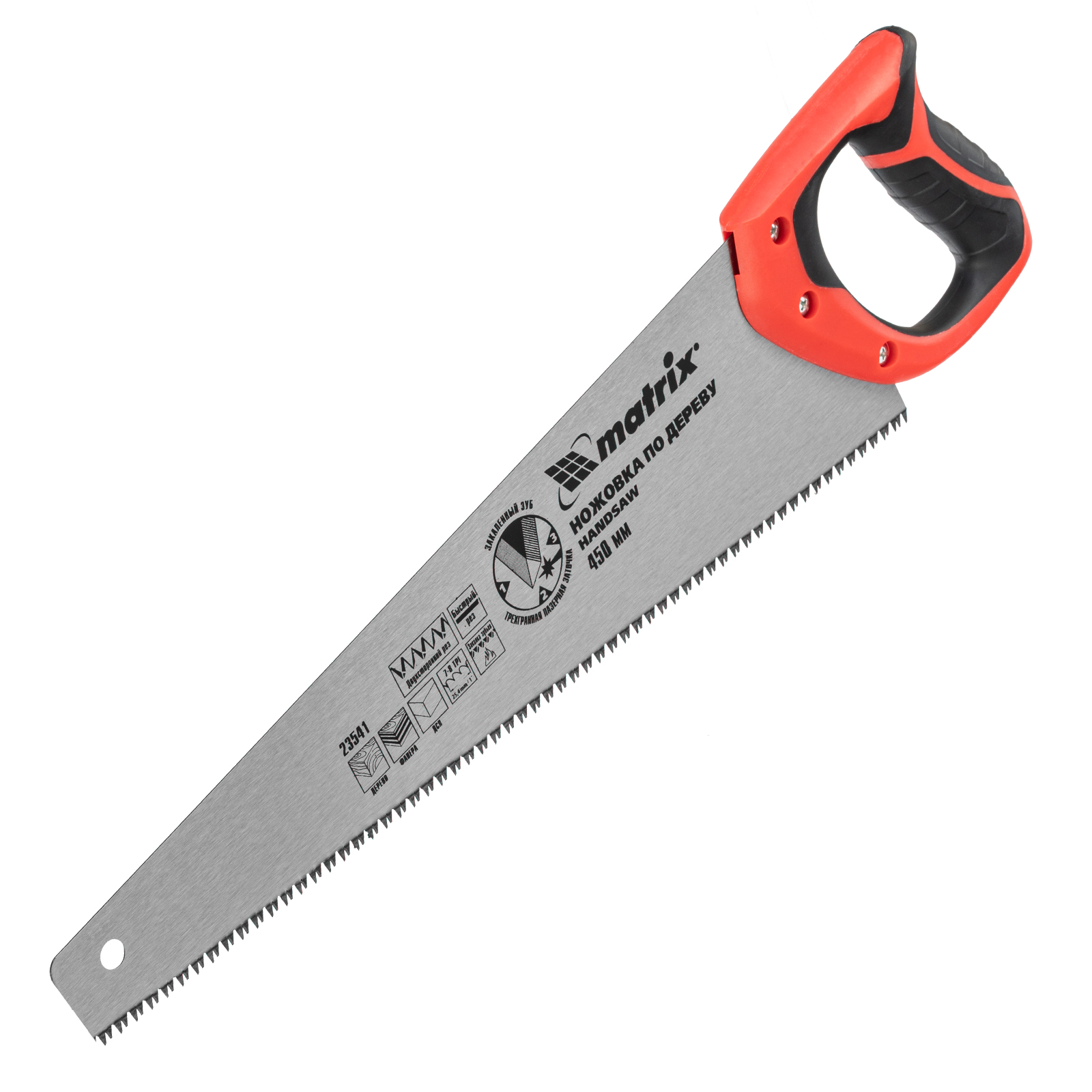 Ножовка по дереву Matrix 23541 с полотном длиной 450 мм, с калеными зубьями с 3D-заточкой и шагом 7-8 TPI, с двухкомпонентной рукояткой, используется для продольного и поперечного пиления досок, брусков, листов фанеры, ДСП. Благодаря трехгранной заточке зубьев пила характеризуется высокой производительностью. Шаг зубьев составляет 7-8 TPI, что обеспечивает быстрый и качественный рез. Ножовка пригодится в столярной мастерской, а также будет полезна в хозяйстве.