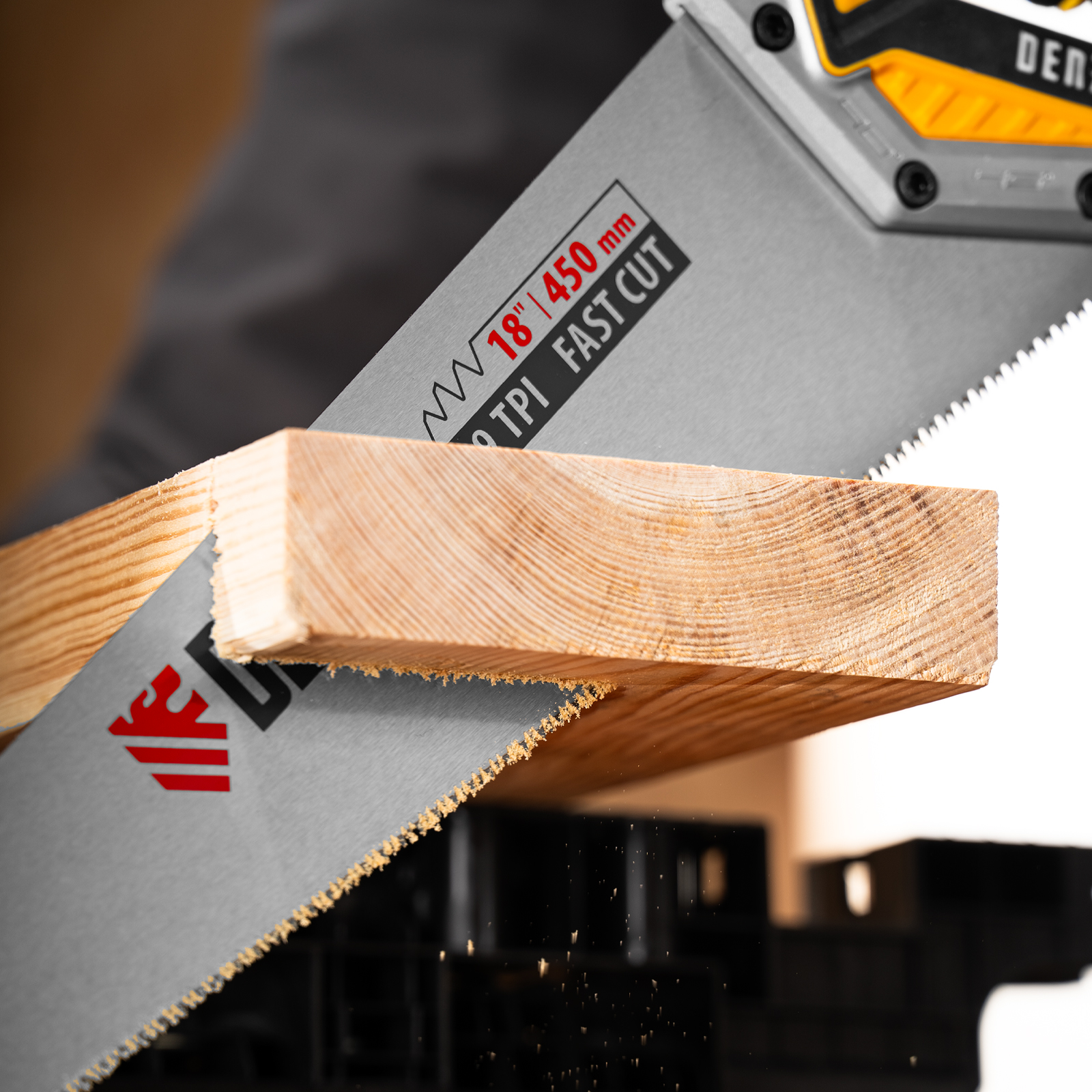 Ножовка по дереву Denzel 24140 длиной 450 мм, с зубьями с шагом 9 TPI и 3D-заточкой, с металлопластиковой рукояткой, предназначена для продольной и поперечной распиловки заготовок из древесины, ДСП, ДВП, МДФ, ламината, а также из ПВХ (труб, панелей, коробов). Подходит для спиливания молодых веток. Зубья с шагом 9 TPI позволяют выполнять быстрый рез. Ножовка используется для проведения столярных работ в мастерской и на дачном участке.