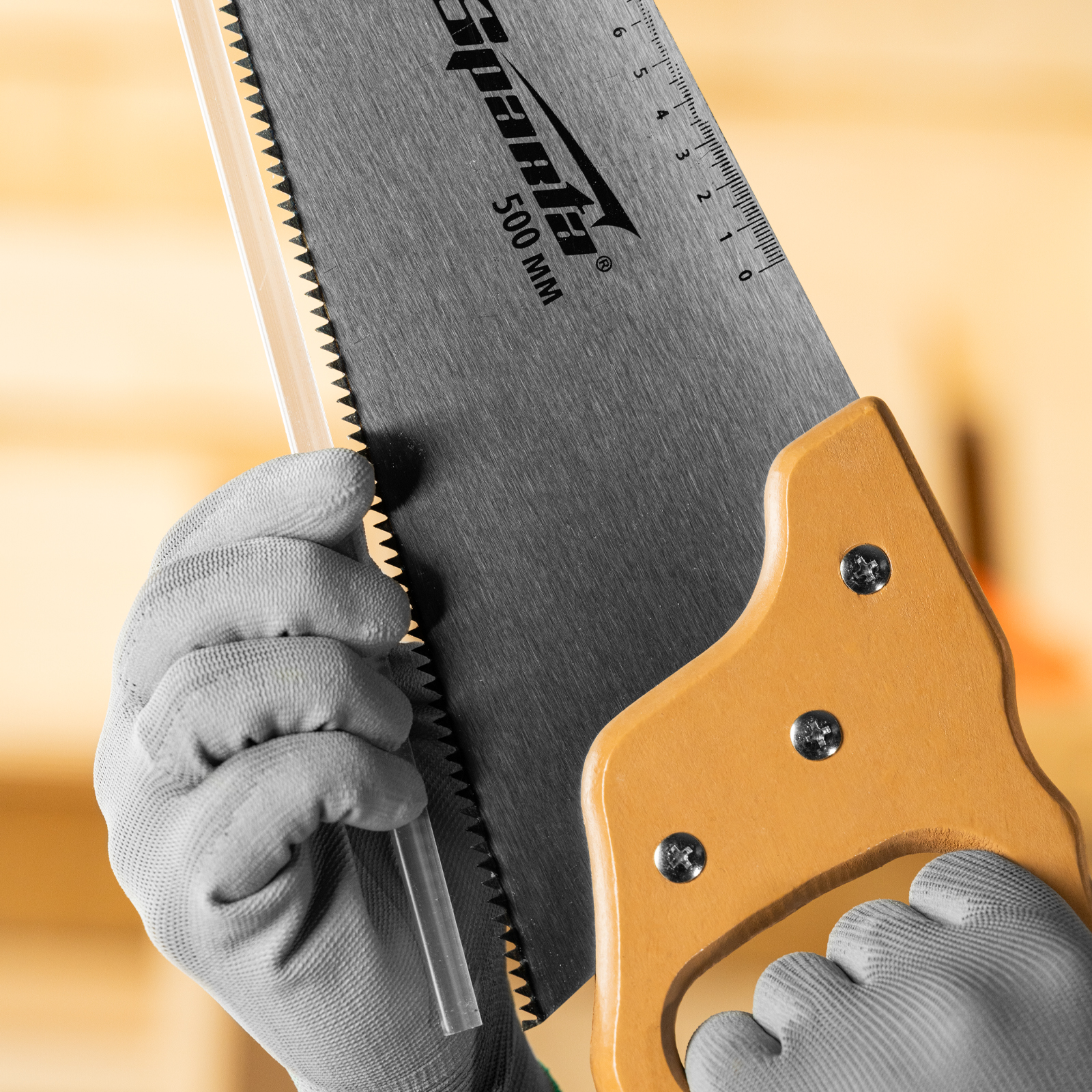 Ножовка по дереву Sparta 231895 с полотном длиной 500 мм, с калеными зубьями с шагом 7-8 TPI, с линейкой и деревянной рукояткой, предназначена для продольно-поперечного распиливания древесины. Благодаря зубьям с 2D-заточкой подходит для двухстороннего реза. Режущую кромку можно перетачивать. На полотно нанесена измерительная шкала, позволяющая производить замеры, не тратя время на поиск линейки. Ножовка используется в столярном и плотницком деле, а также полезна дома и на даче.