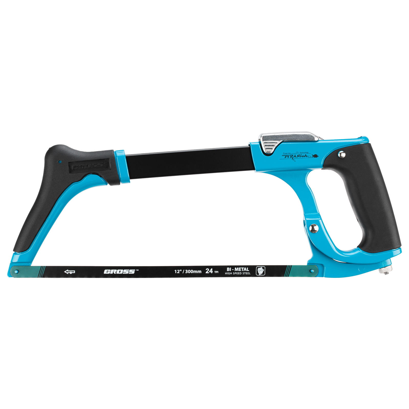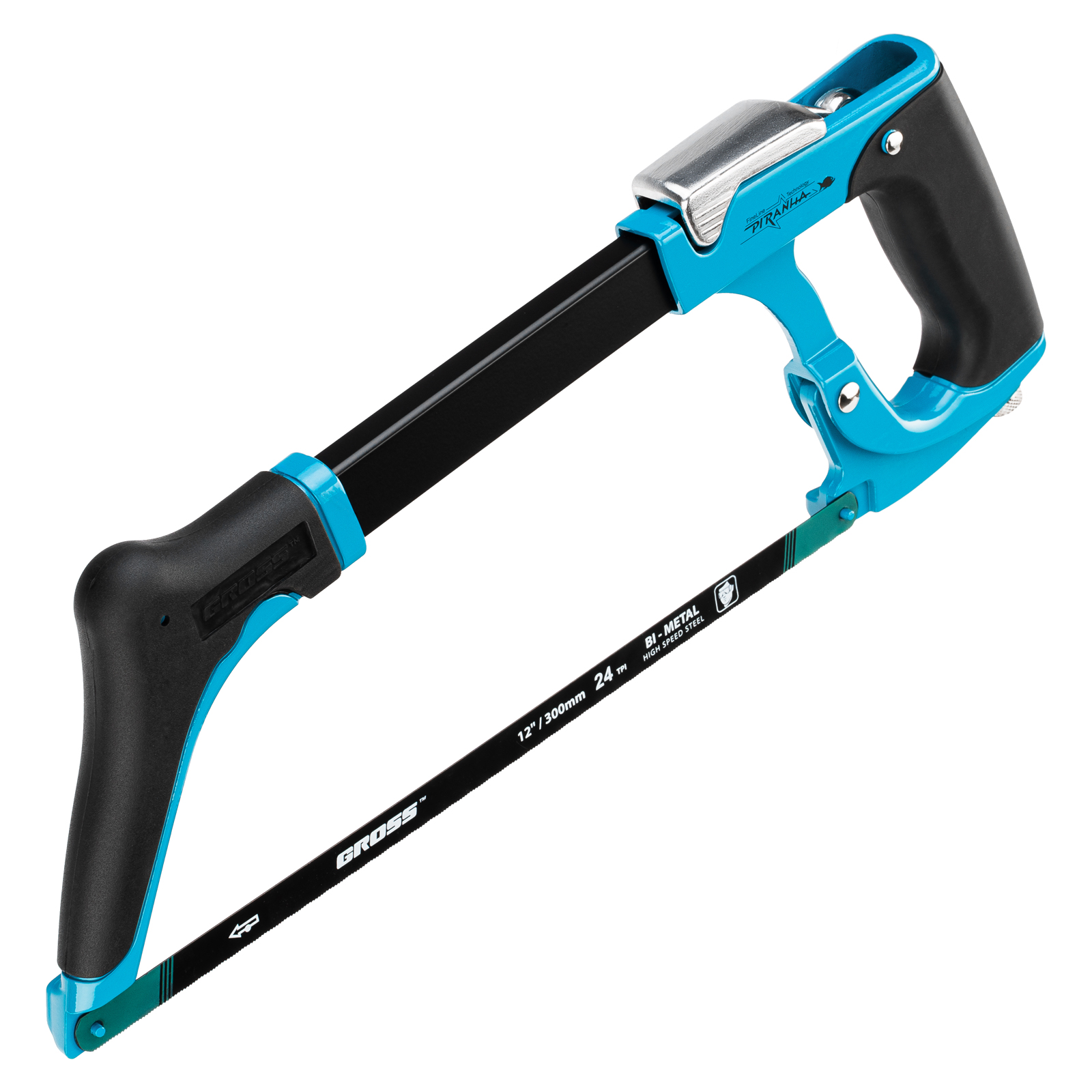 Ножовка по металлу Gross «PIRANHA» 77604, 300 мм, с рычажным механизмом натяжения полотна подходит для профессиональных строительных и слесарных операций. Подходит для поперечного и продольного реза заготовок за счет возможности установки полотна под углом 45° и 90°.