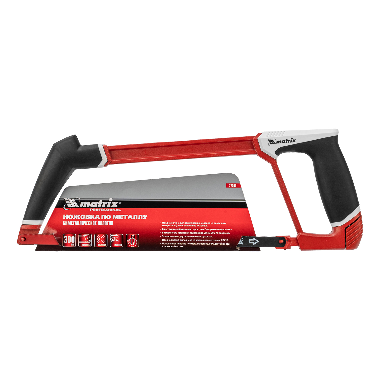 Ножовка по металлу Matrix 77599, 300 мм, с биметаллическим полотном и двухкомпонентной рукояткой, оптимально подходит для распиливания стали, алюминия и пластика. Она пригодится для решения профессиональных задач в процессе строительных и слесарных работ. Предусмотрена установка полотна под углом 90° и 45° для выполнения продольного пропила.