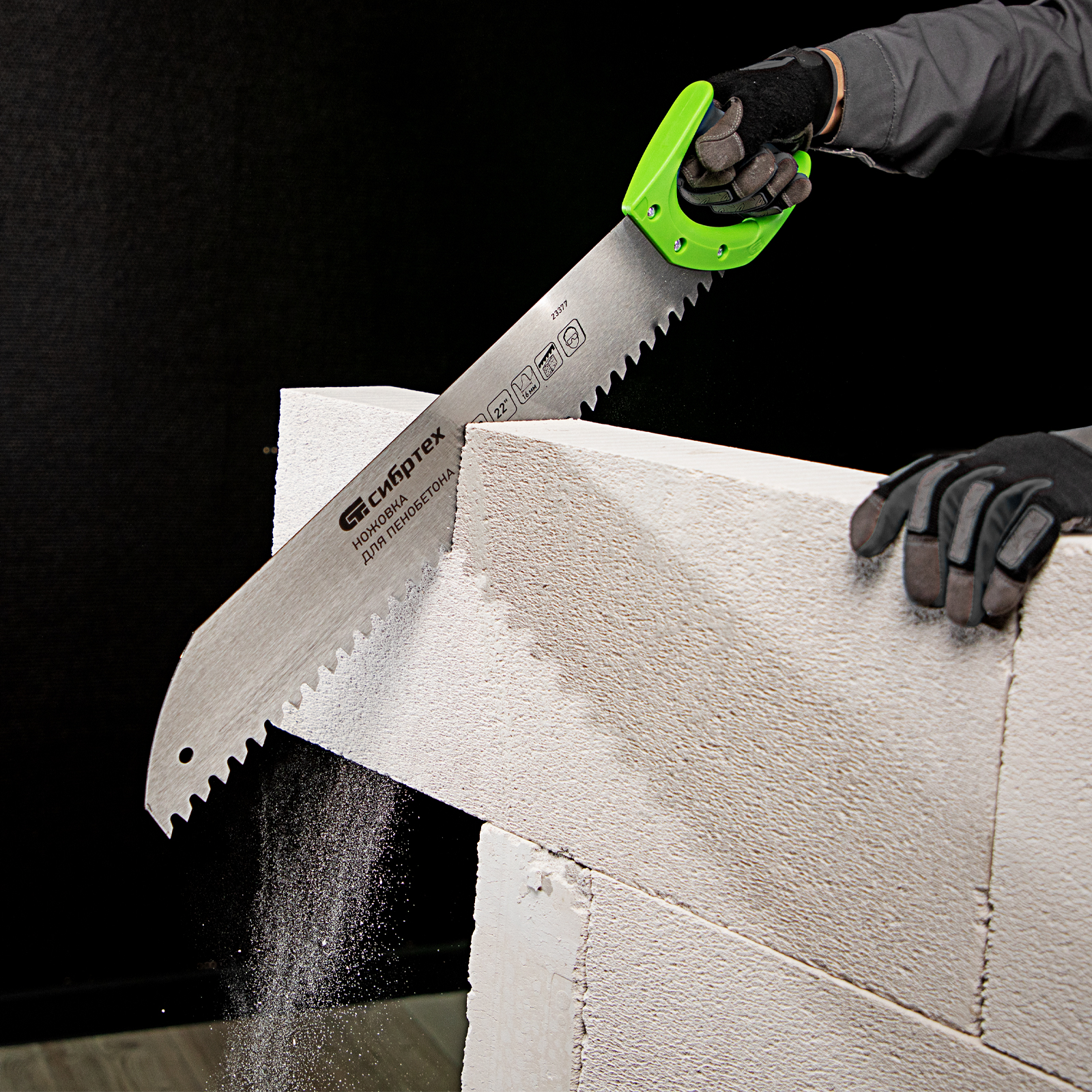 Ножовка Сибртех 23377 с полотном длиной 550 мм, с двухкомпонентной рукояткой, используется для распиливания небольших блоков из пенобетона. Высокая эффективность работы достигается благодаря крупным зубьям с шагом 16 мм и двухгранной заточкой. Ножовка применяется во время строительных работ.