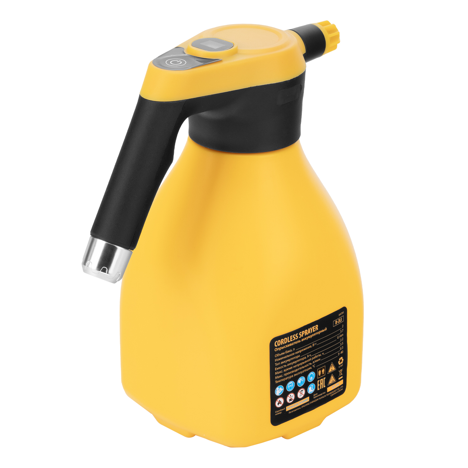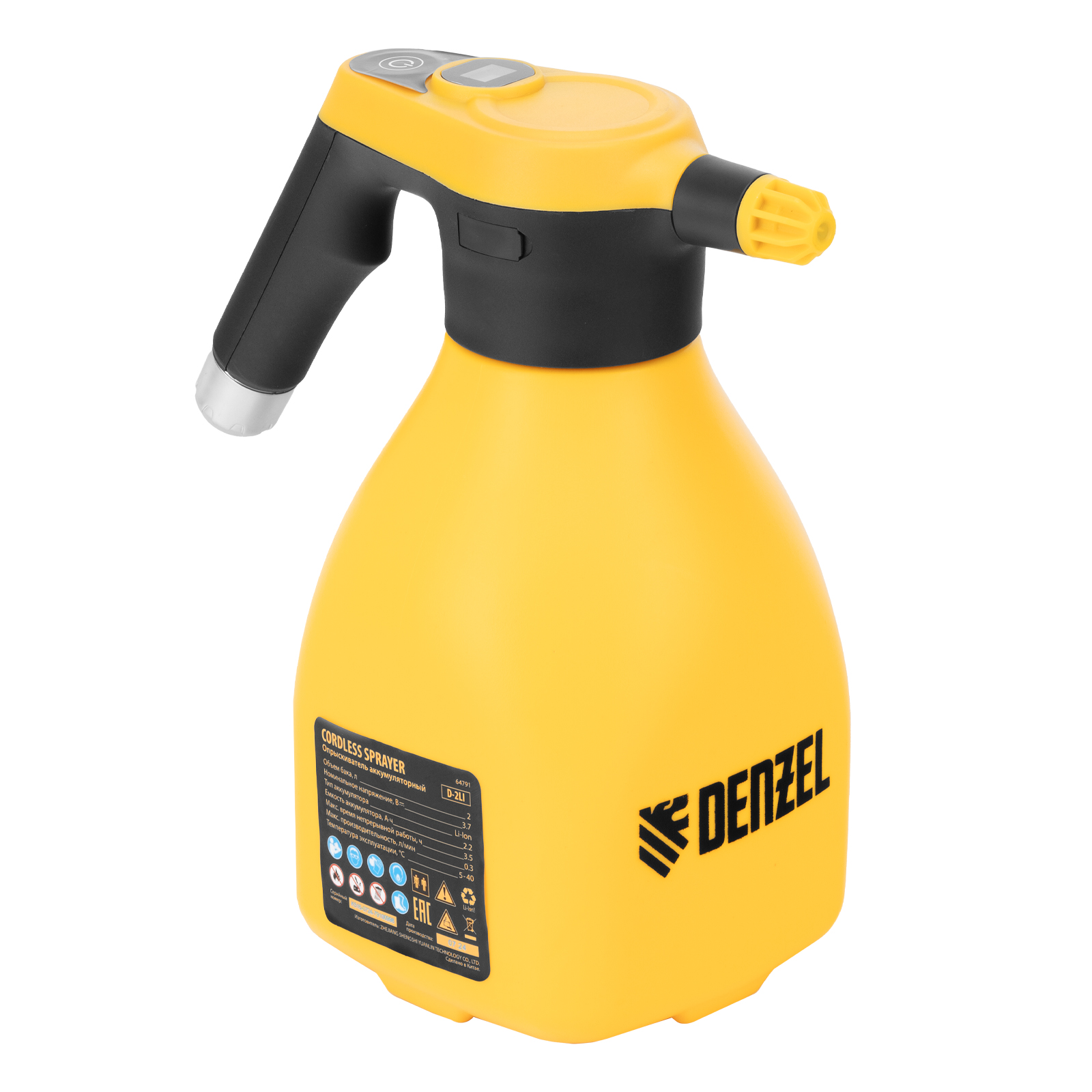 Аккумуляторный опрыскиватель Denzel D-2LI 64791 с баком объемом 2 л и Li-Ion батареей на 3,7 В, емкостью 2,2 А·ч, предназначен для ухода за растениями — внесения жидких удобрений, распыления инсектицидных средств. Также может использоваться для мытья окон, фасадов, дорожек, садового инвентаря. Размер и форма факела регулируются, максимальная дальность распыления составляет 1 м, что позволяет обрабатывать участки различной площади и удаленные места. Опрыскиватель экономит силы и время пользователя, будет полезен в быту и на производстве.