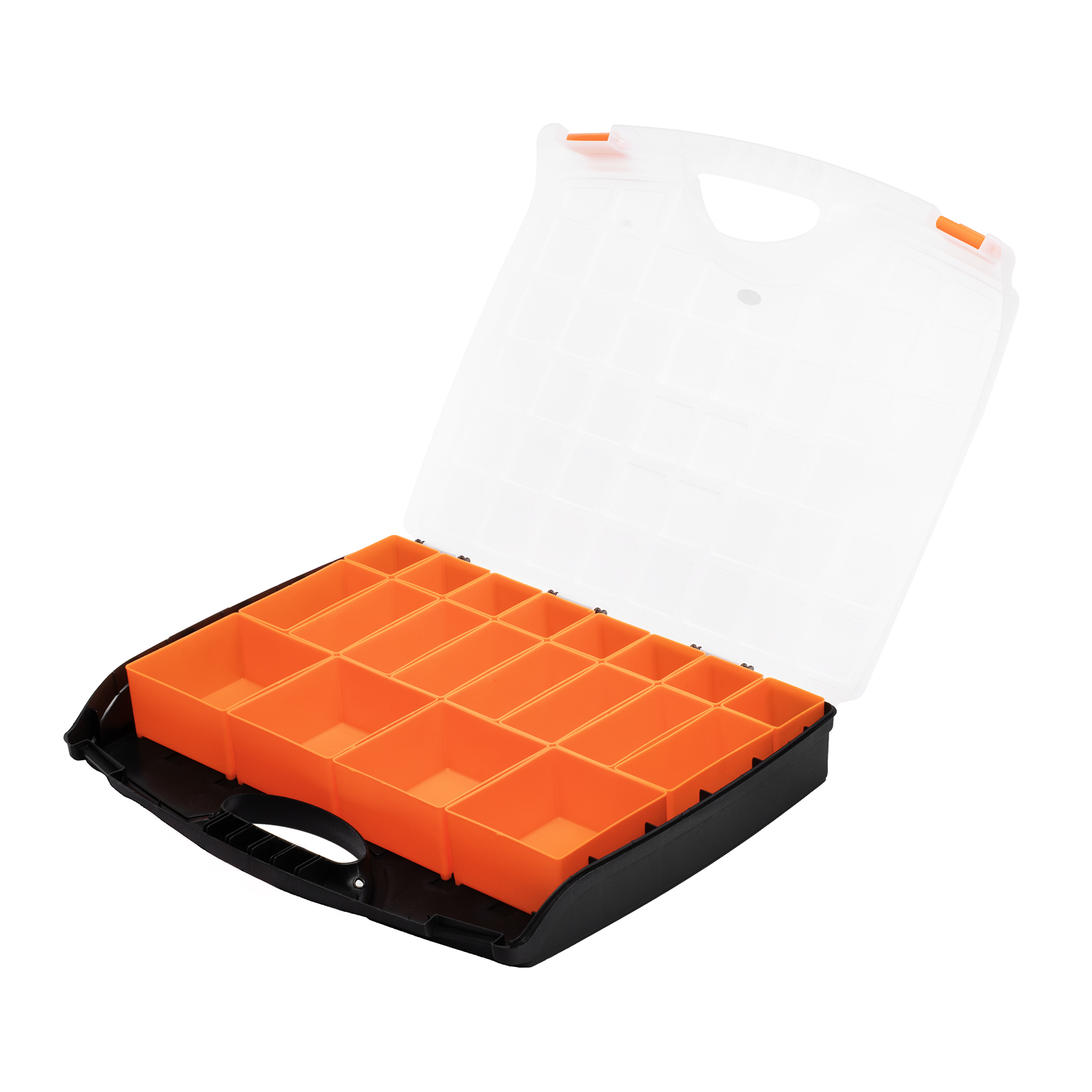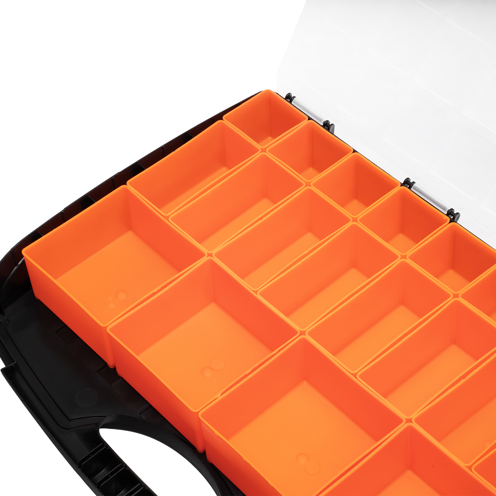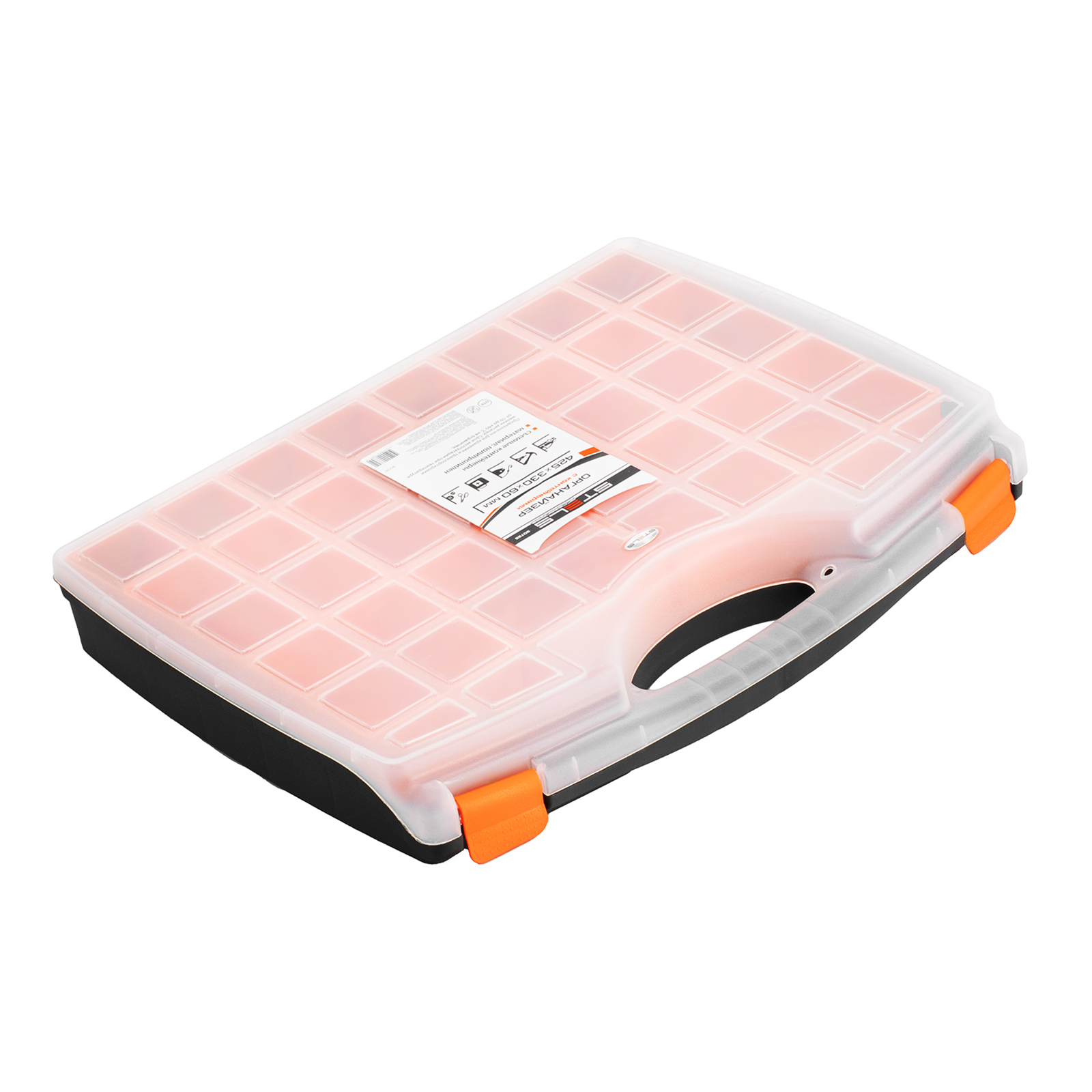 - Защелки и ручка обеспечивают удобство транспортировки органайзера.