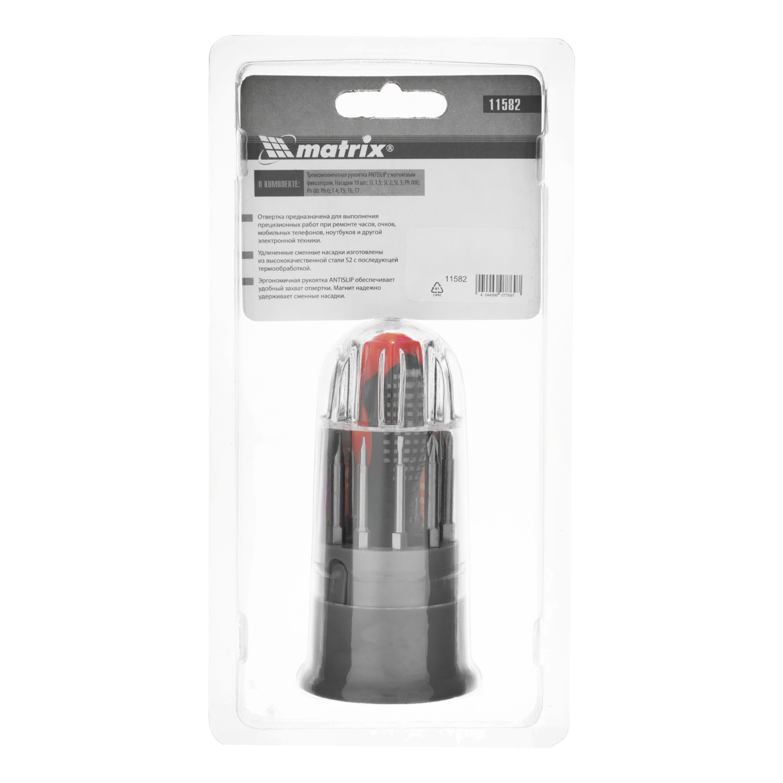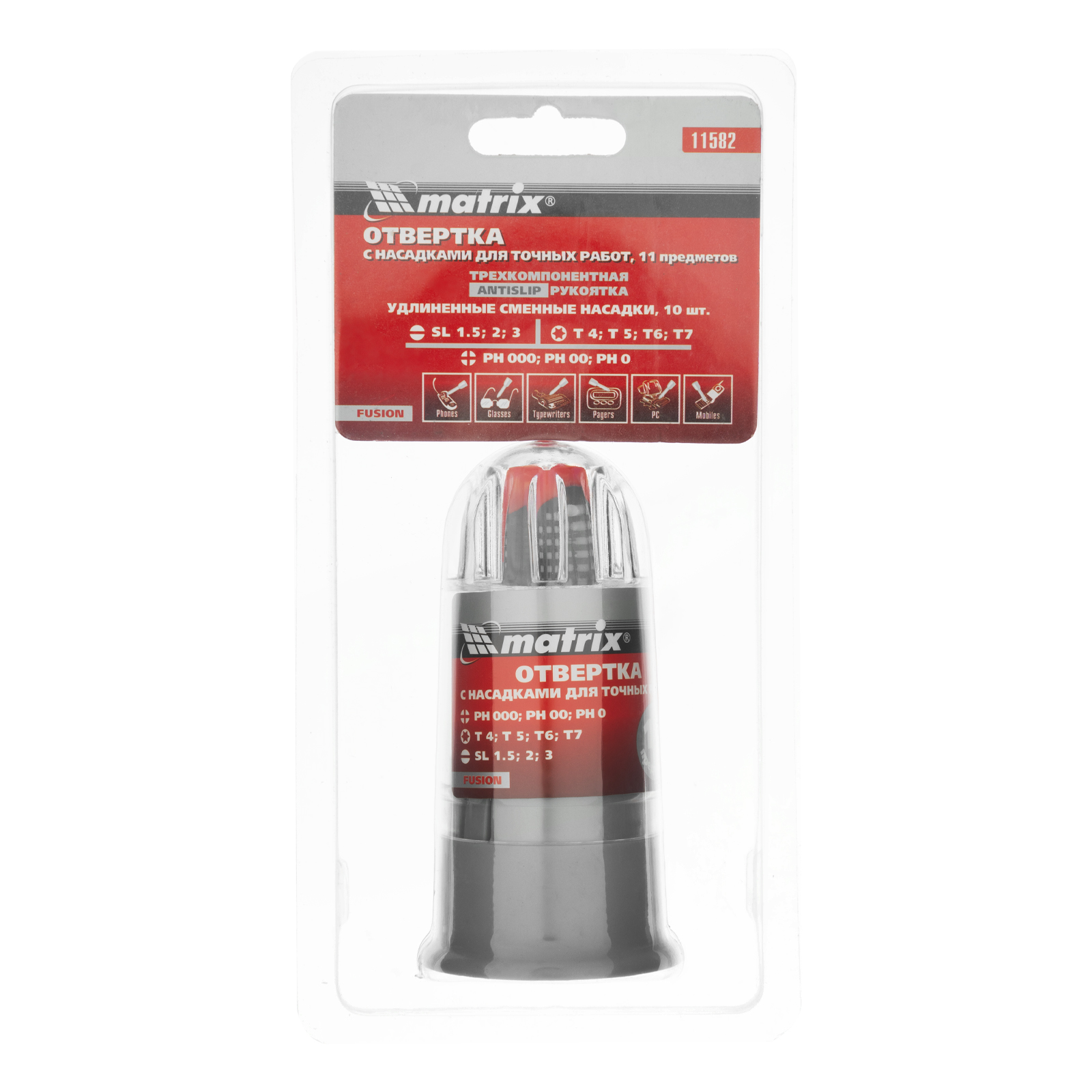 Отвертка для точных работ Matrix Fusion 11582 с 3-х компонентной рукояткой, с насадками, — это набор из 11 предметов в пластиковом пенале, который используется для ремонта электротехники, очков, мобильных телефонов, ноутбуков и т.д. Набор пригодится профессиональным мастерам. 10 удлиненных бит с зауженным профилем обеспечивают возможность работы в углублениях.