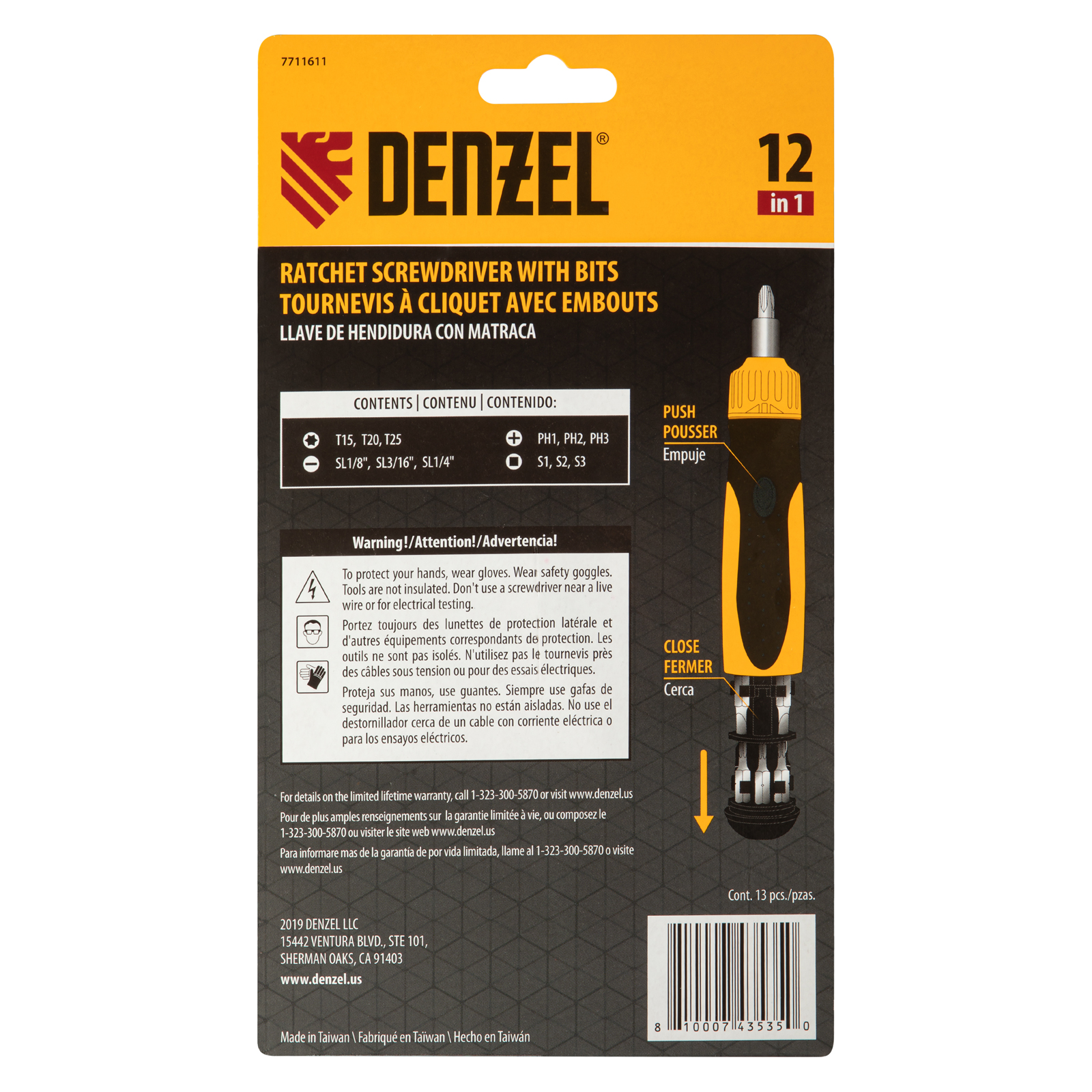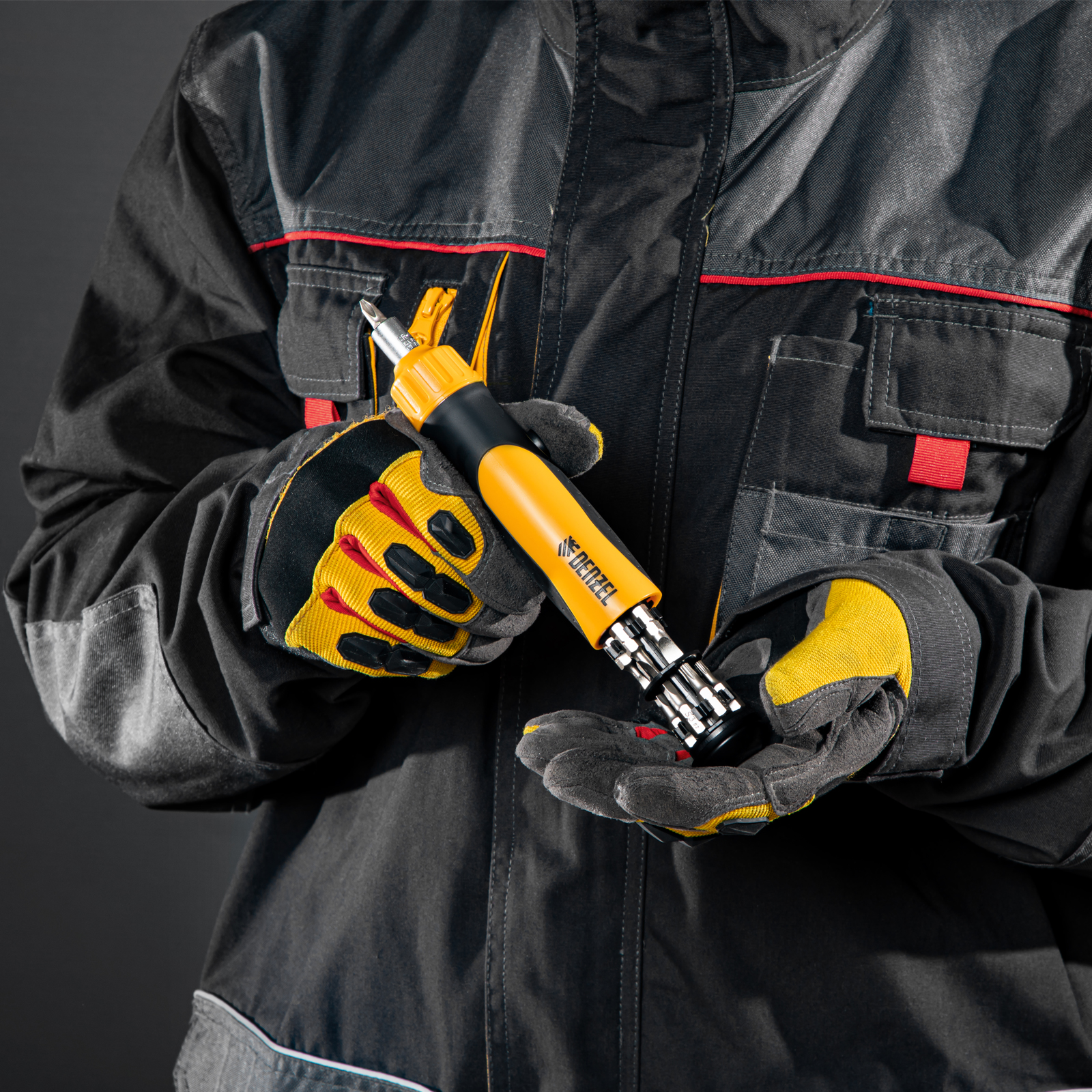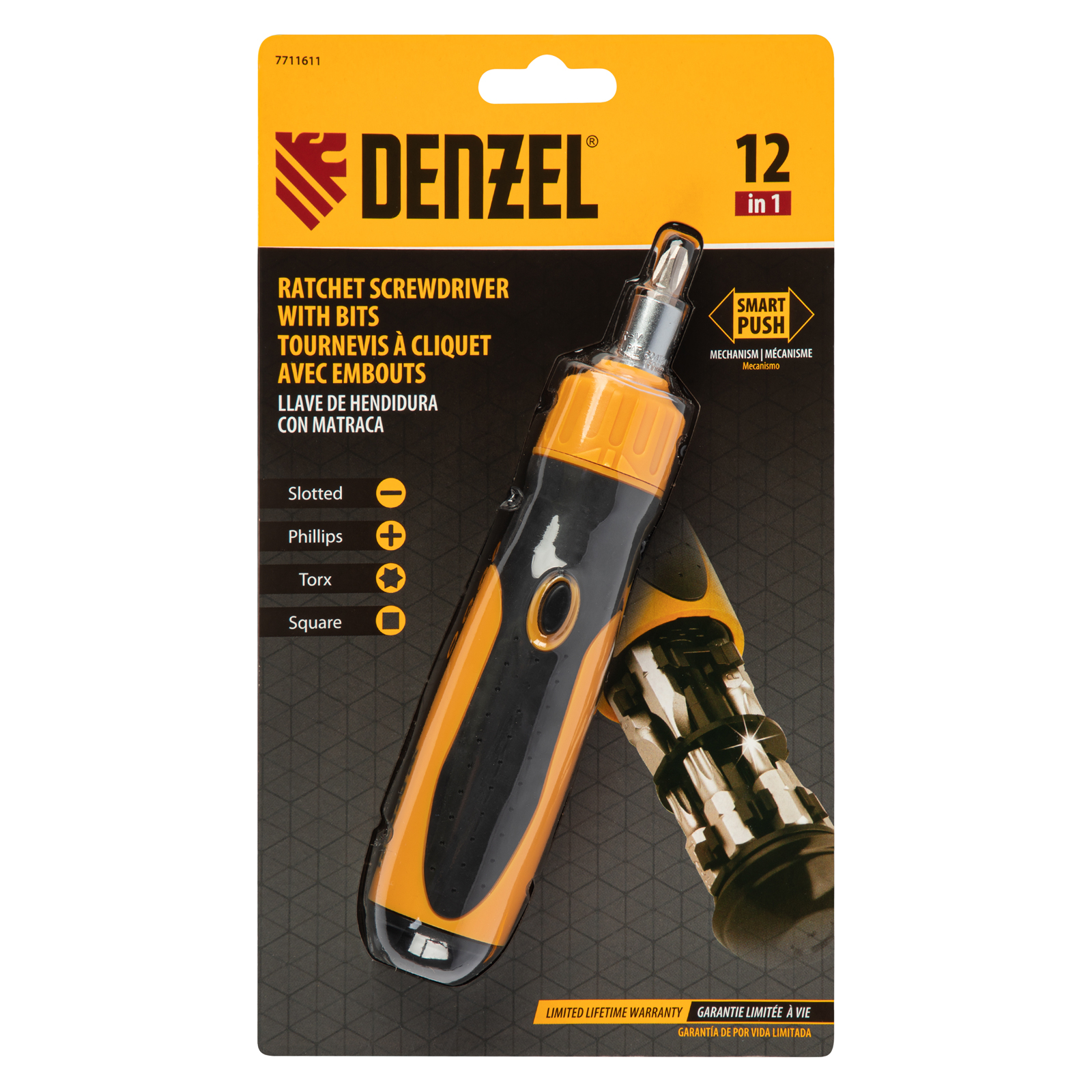 Реверсивная отвертка Denzel 7711611 с механизмом SmartPush комплектуется 12 битами из стали S2 для работы с крепежом типа PH, SL, TORX и SQUARE. Реверсивный механизм избавляет от необходимости перехватывать отвертку, что повышает скорость проведения работ. Отвертка универсальна, т. к. с ней можно использовать любые биты длиной 25 мм с хвостовиком 1/4". Она будет полезна не только частным мастерам, но и профессионалам.
