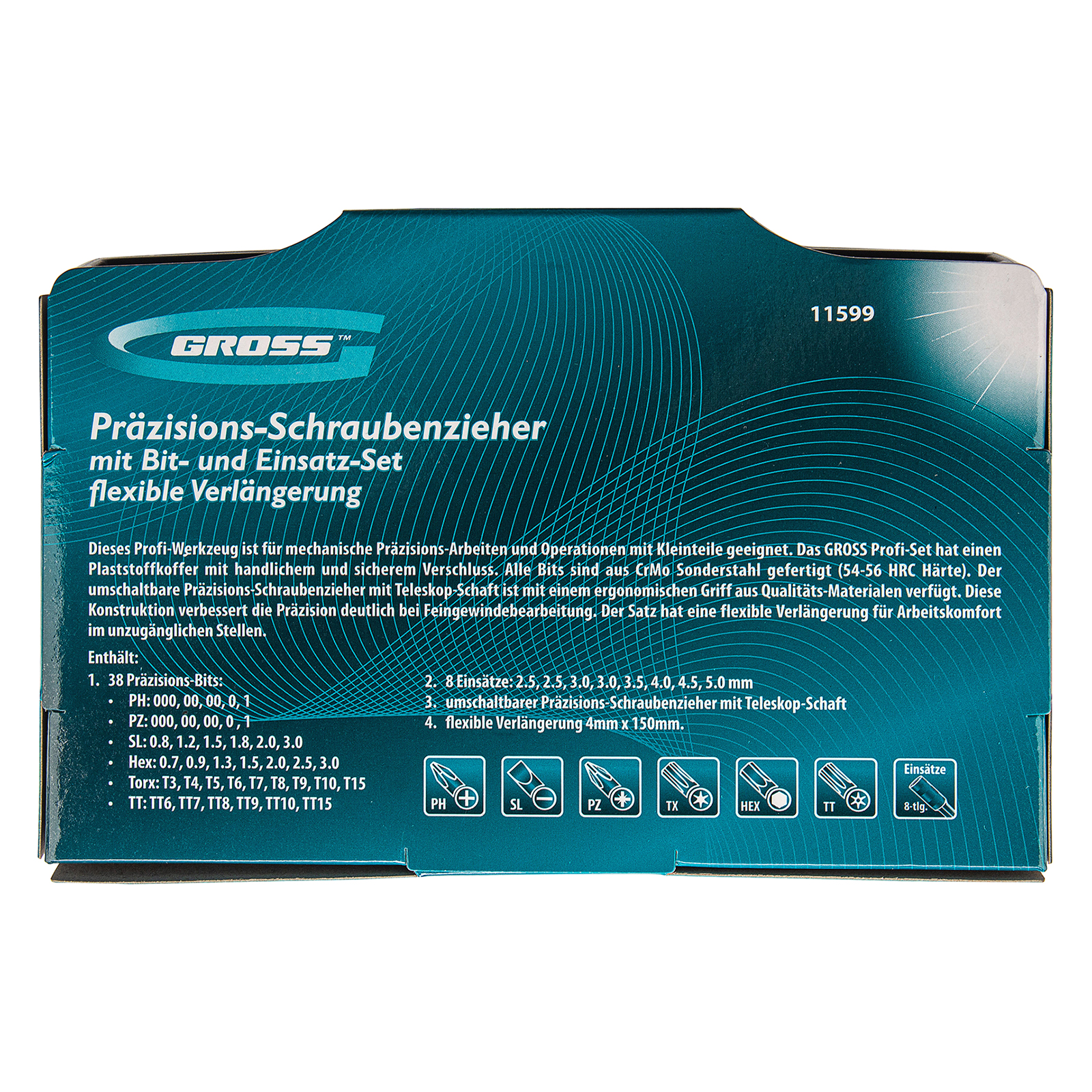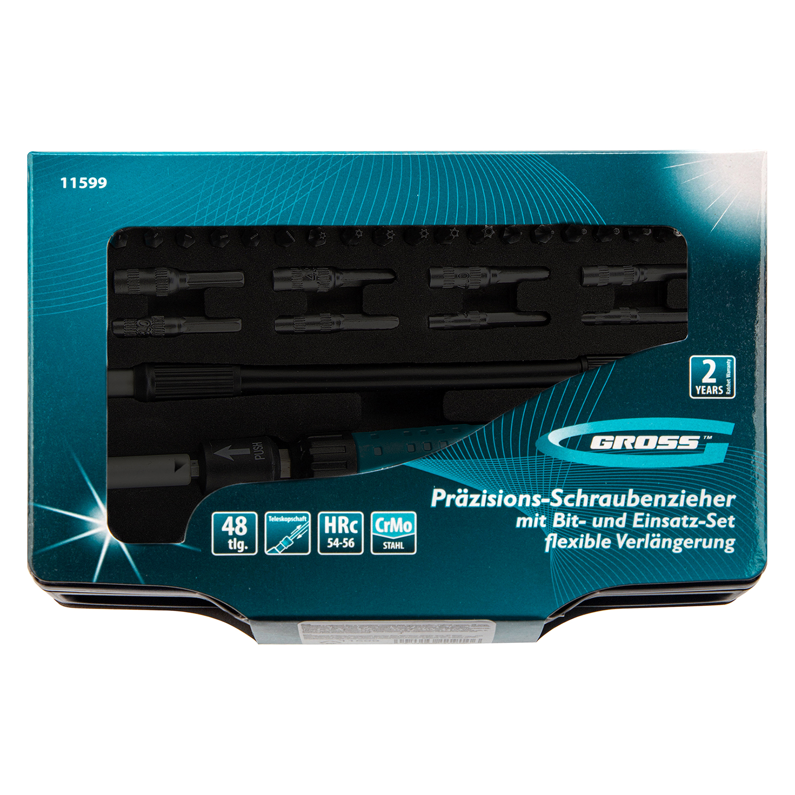 Отвертка с набором бит и торцевых головок Gross 11599, с гибким приводом, 48 предметов из стали CrMo, рассчитана на осуществление точных работ. С ее помощью можно отремонтировать очки, игрушки, портативную и бытовую технику и т.д. К отвертке прилагаются выдвижной стержень и гибкий удлинитель, позволяющие работать с мелкими деталями в углублениях и труднодоступных местах.
