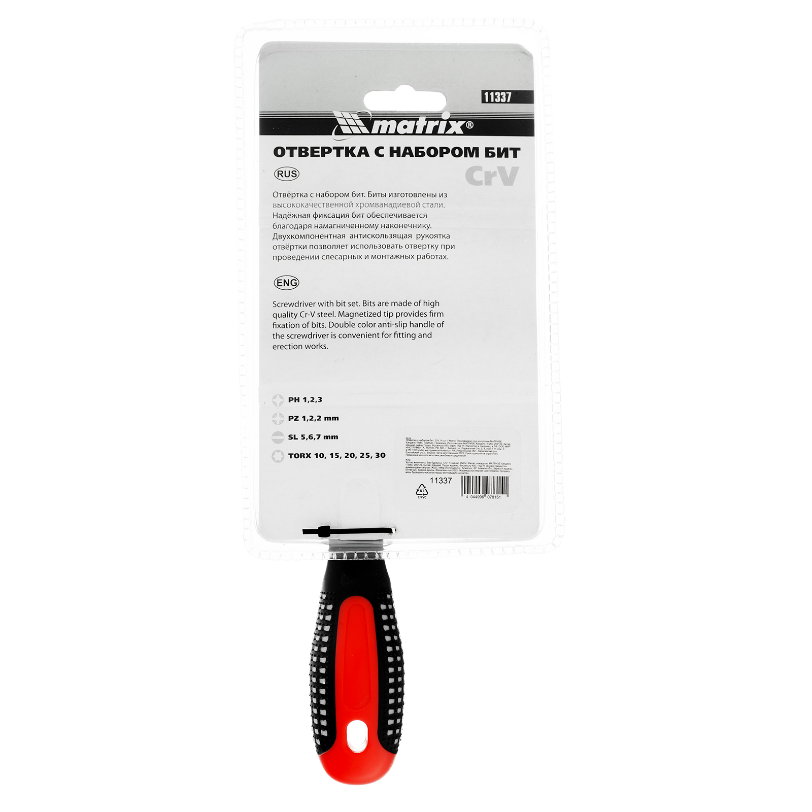Отвертка Matrix 11337 с набором из 14 бит из стали CrV служит для откручивания и закручивания резьбового крепежа со шлицами SL, PH, PZ и Torx. Заменяет комплект стандартных отверток. Присоединительный шестигранник с магнитом надежно удерживает биту, не давая ей выскочить во время работы. Набор подходит для профессионального и бытового применения.