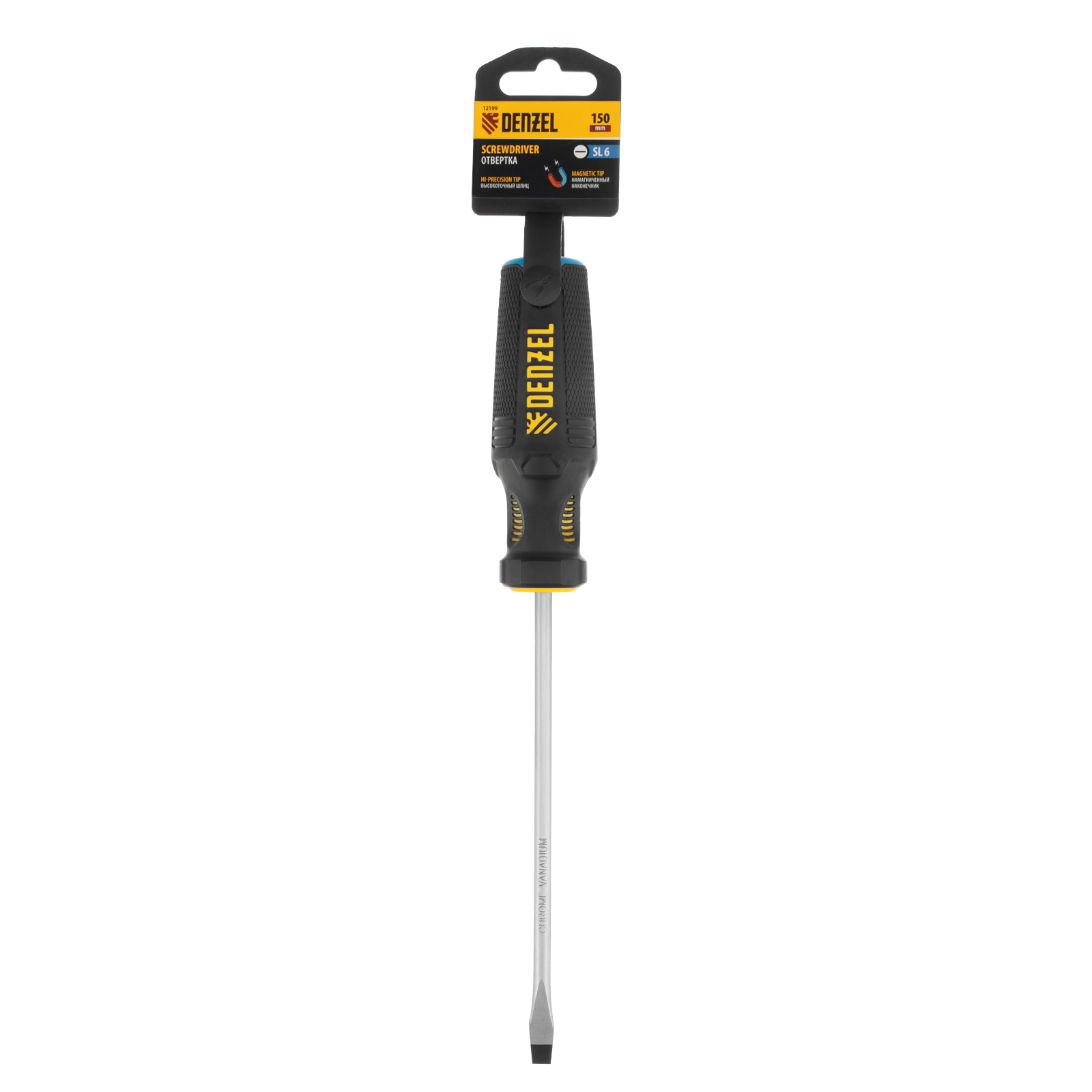 Отвертка SL6 х 150 мм Denzel 12199 из стали CrV, с трехкомпонентной рукояткой, используется для монтажа и демонтажа винтов и саморезов с прямым шлицем Slotted. Намагниченный шлиц крепко фиксируется в головке крепежа. Отвертка выдерживает интенсивное применение и предназначена для выполнения профессиональных ремонтных и монтажных работ.