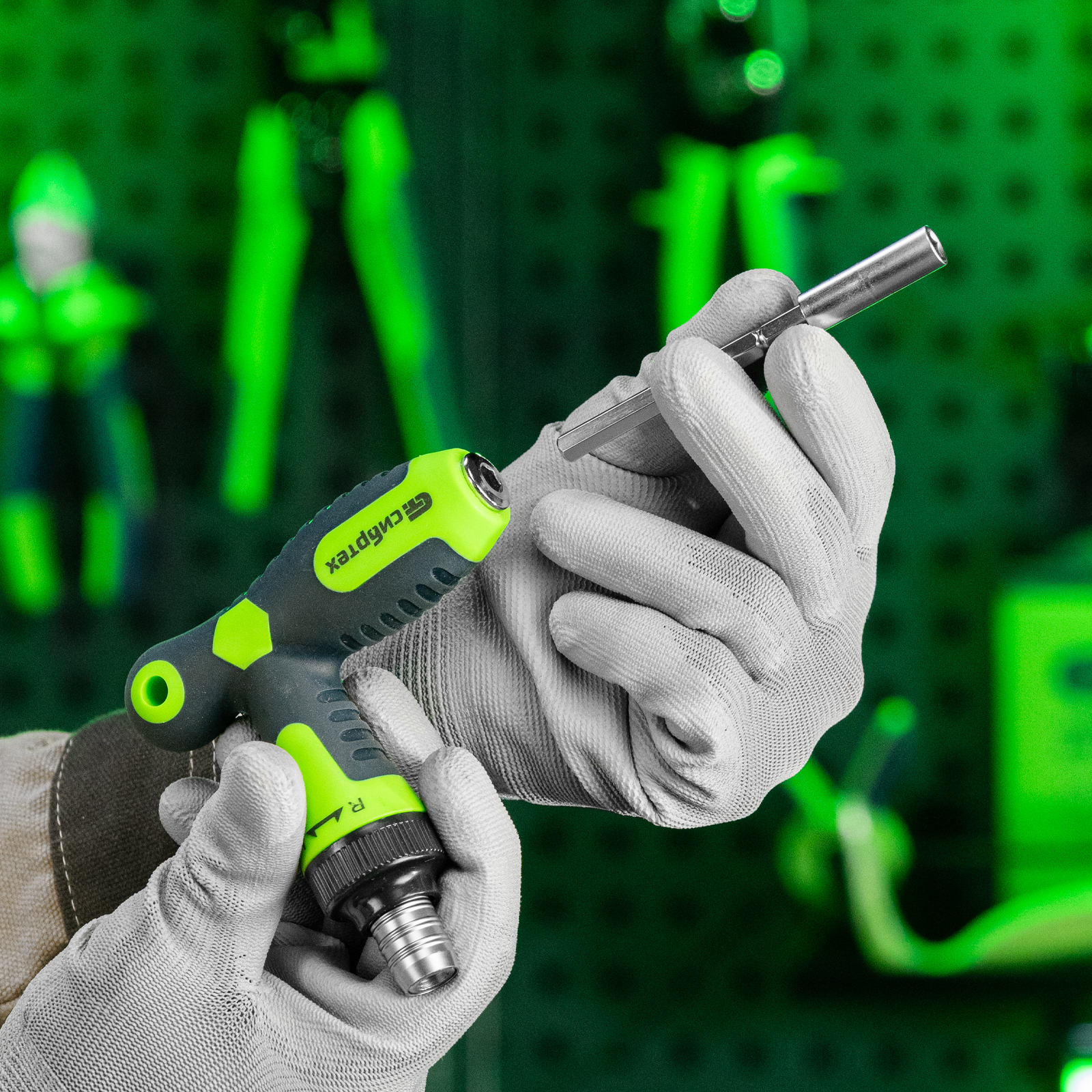 Т-образная реверсивная отвертка с набором бит и торцевых головок Сибртех 13382 входит в комплект из 33 предметов, выполненных из стали CrV. Инструменты предназначены для монтажа/демонтажа резьбовых соединений в условиях ограниченного пространства, где обычную отвертку использовать затруднительно. Набор включает биты для крепежа с профилем SL, PH, PZ, TR, TT, TW, TA, HEX, SPAN и торцевые головки для болтовых соединений.