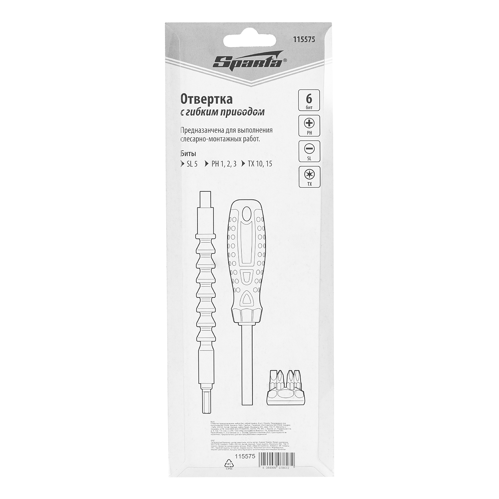 Отвертка телескопическая, набор бит, гибкий привод, 8 шт, Sparta в Челябинске