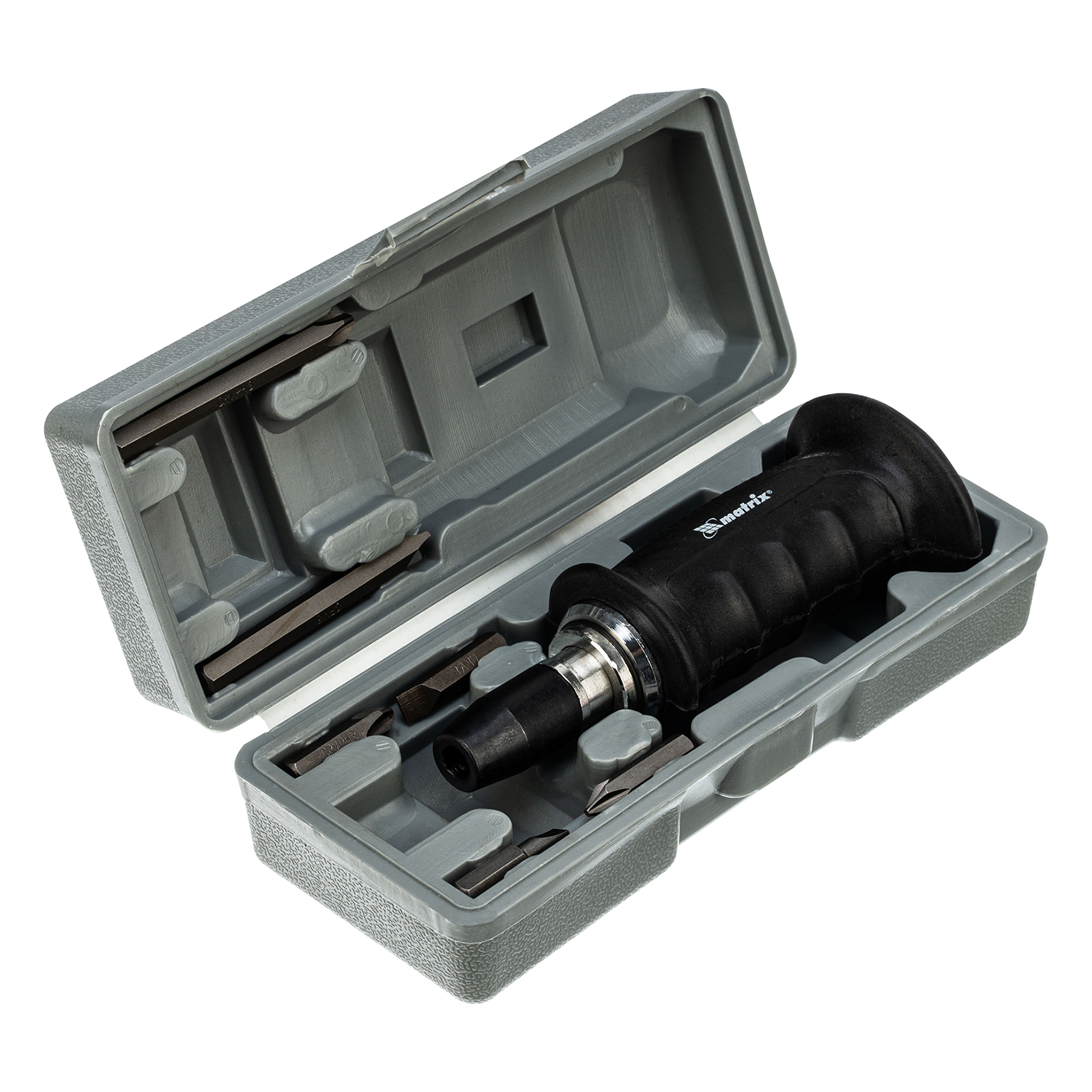 Ударно-поворотная отвертка Matrix 11561 с черной ручкой, с присоединительным шестигранником 1/2", с набором из 6 бит., в пластиковом кейсе, предназначена для работы с резьбовыми соединениями, в том числе для демонтажа перетянутых или заржавевших крепежей. Металлический затыльник выдерживает удары молотком. Отвертка используется при проведении ремонта автомобильной и другой техники, рекомендована для профессионального применения.