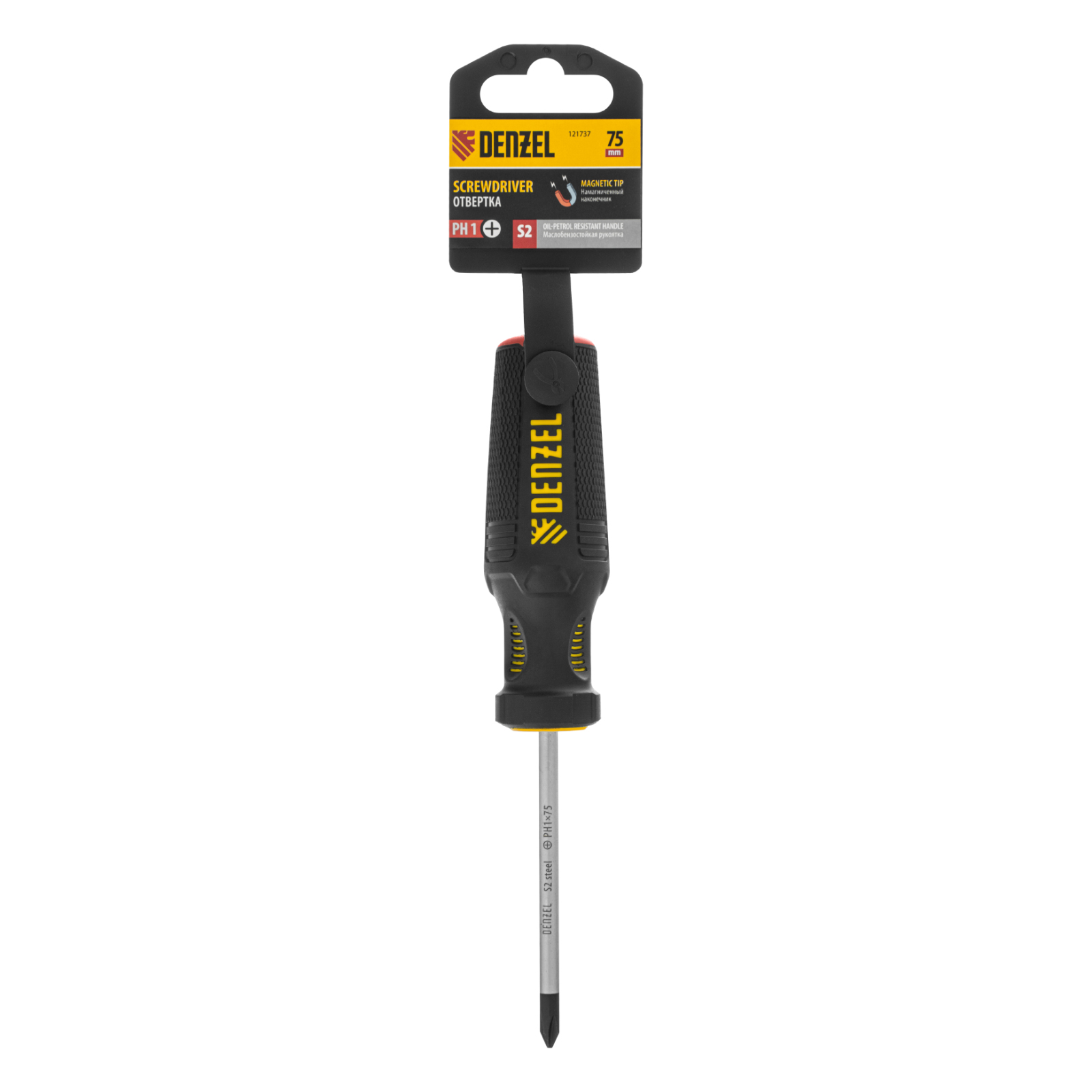 Отвертка Denzel 121737 с трехкомпонентной рукояткой, со стержнем из стали S2, длиной 75 мм, предназначена для закручивания и откручивания резьбового крепежа типа PH1. Высокоточный намагниченный шлиц избавляет мастера от необходимости придерживать винт или саморез рукой. Отвертка рекомендована для профессионального использования.