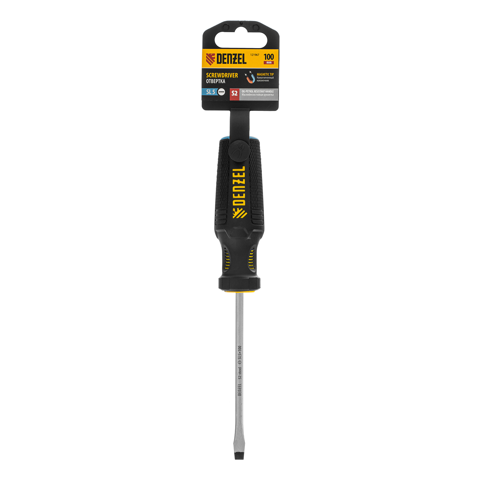 Отвертка Denzel 121967 с трехкомпонентной рукояткой, со стержнем из стали S2, длиной 100 мм, предназначена для монтажа и демонтажа винтов и саморезов с прямым шлицем SL5. Высокоточный намагниченный шлиц крепко фиксируется в головке крепежа. Отвертка выдерживает интенсивное применение, предназначена для выполнения профессиональных ремонтных и монтажных работ.