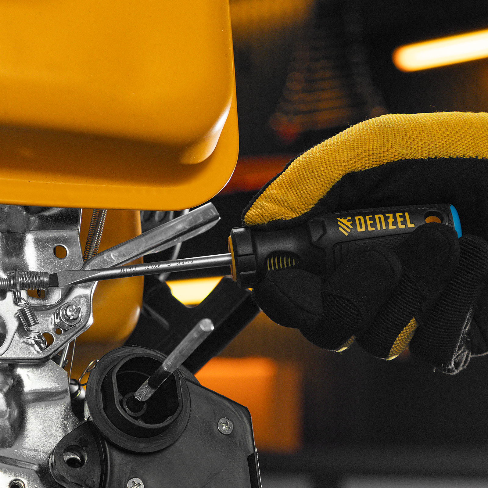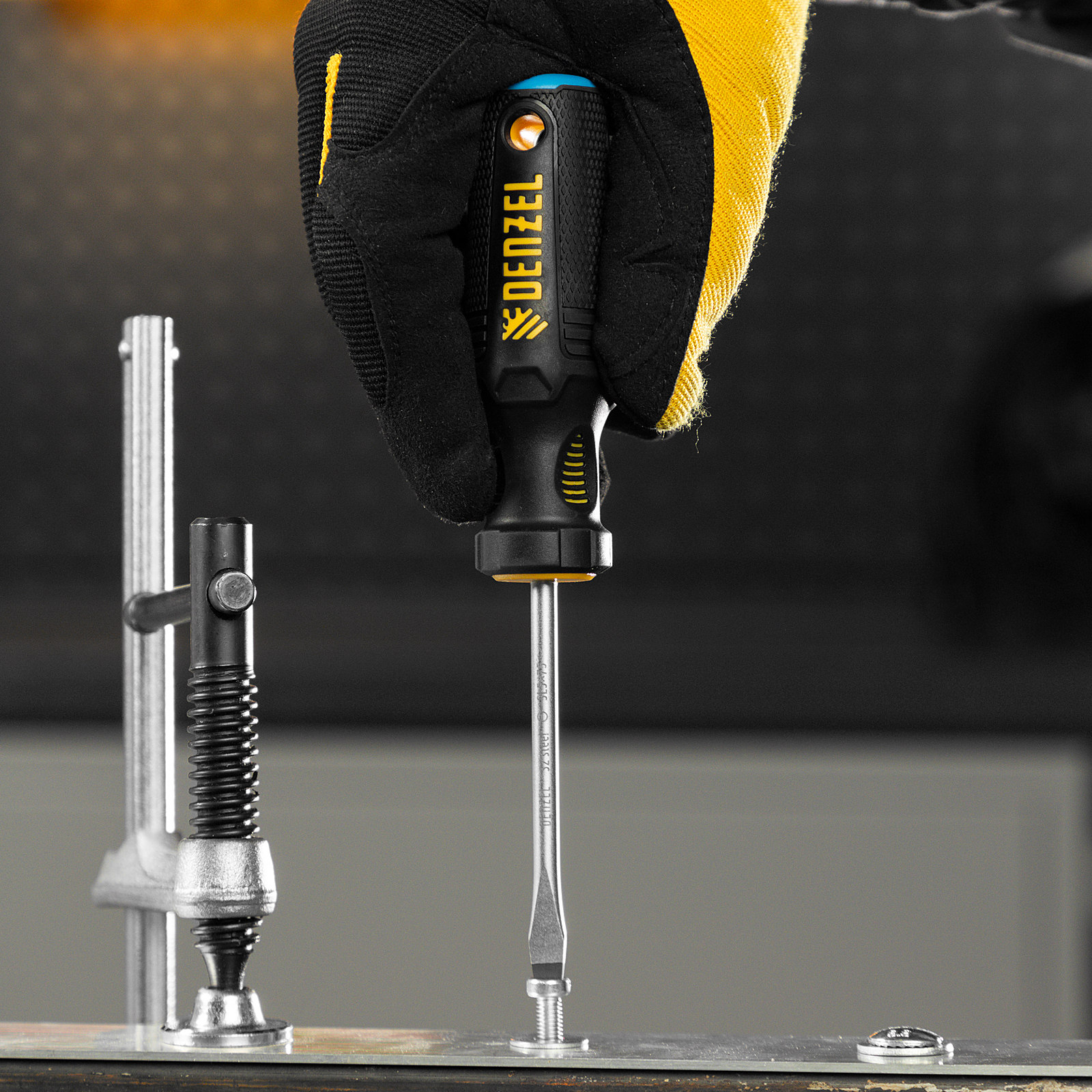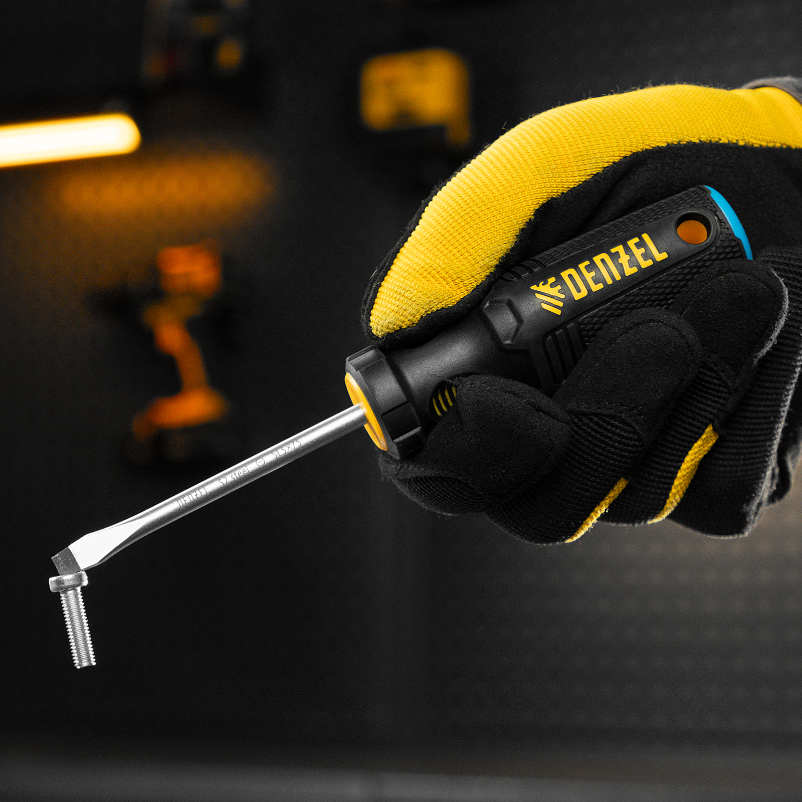Отвертка Denzel 121947 с трехкомпонентной рукояткой, со стержнем из стали S5, длиной 75 мм, предназначена для монтажа и демонтажа винтов и саморезов с прямым шлицем SL5. Высокоточный намагниченный шлиц крепко фиксируется в головке крепежа. Отвертка выдерживает интенсивное применение, предназначена для выполнения профессиональных ремонтных и монтажных работ.