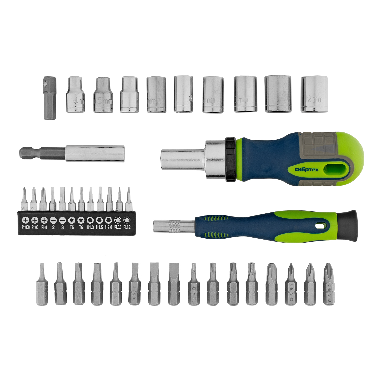 Реверсивные отвертки с набором бит и торцевых головок Сибртех 13338 — комплект из 41 предмета из стали CrV, включающий насадки для работы с крепежом типа SL, PH, PZ, HEX, TORX, а также для монтажа/демонтажа гаек, болтов, саморезов с внешним шестигранником. Отвертка и биты для точных работ позволяют отремонтировать мелкую электронику, очки, детские игрушки и т.д. Удлинитель облегчает работу в труднодоступных местах.