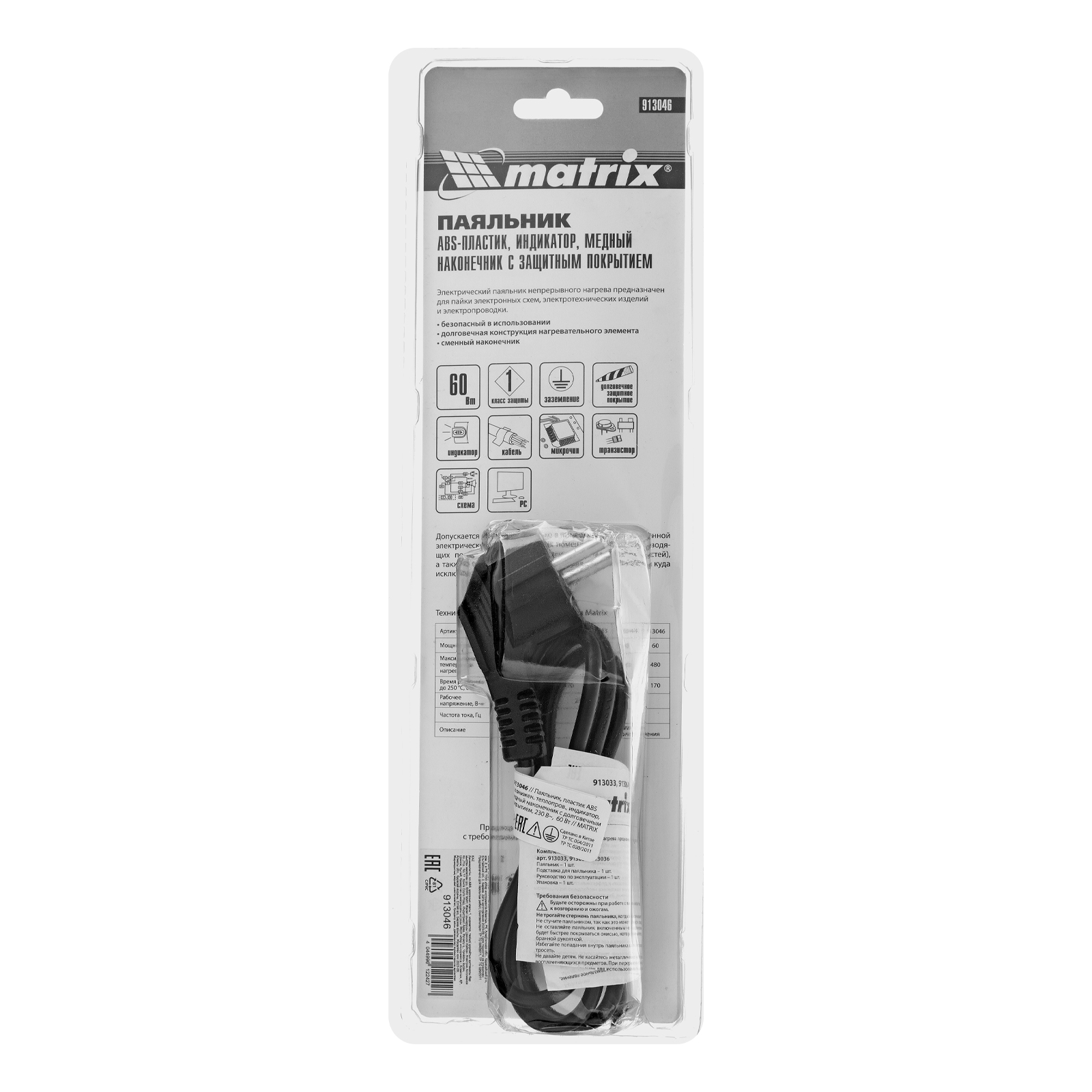Паяльник Matrix 913046, 220 В, 60 W, с корпусом из пластика ABS, индикатором и медным наконечником с долговечным гальваническим покрытием, имеет класс защиты 1 и используется для пайки микрочипов, транзисторов, проводки и электросхем. Поставляется с припоем в пластиковой тубе, поэтому полностью готов к работе. Благодаря нихромовой спирали и корпусу из ударопрочного ABS-пластика паяльник устойчив к повреждениям и рассчитан на длительный срок службы. Конусовидное жало удобно для прецизионной пайки. Прибор пригодится радиолюбителям, автоэлектрикам, а также будет полезен в быту.