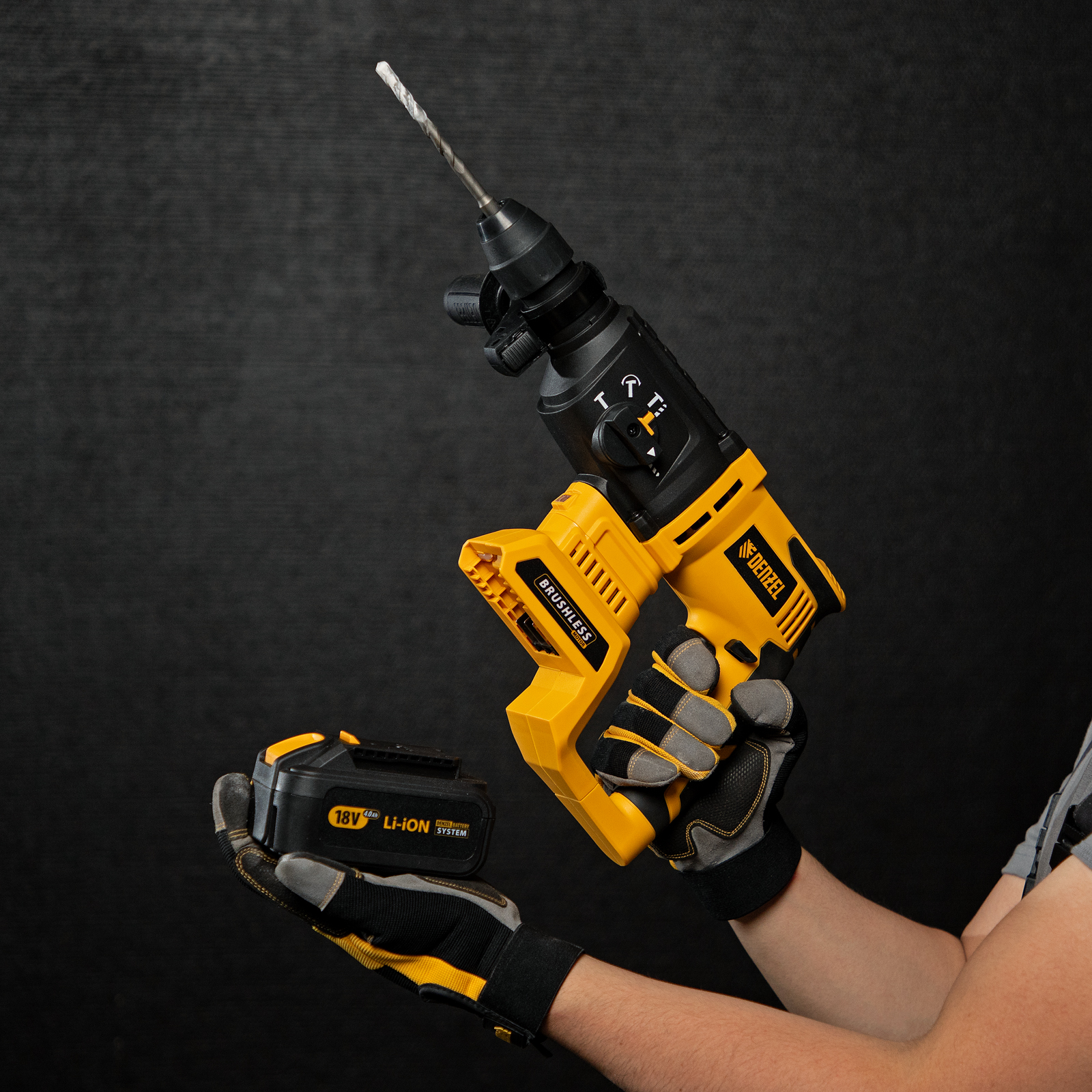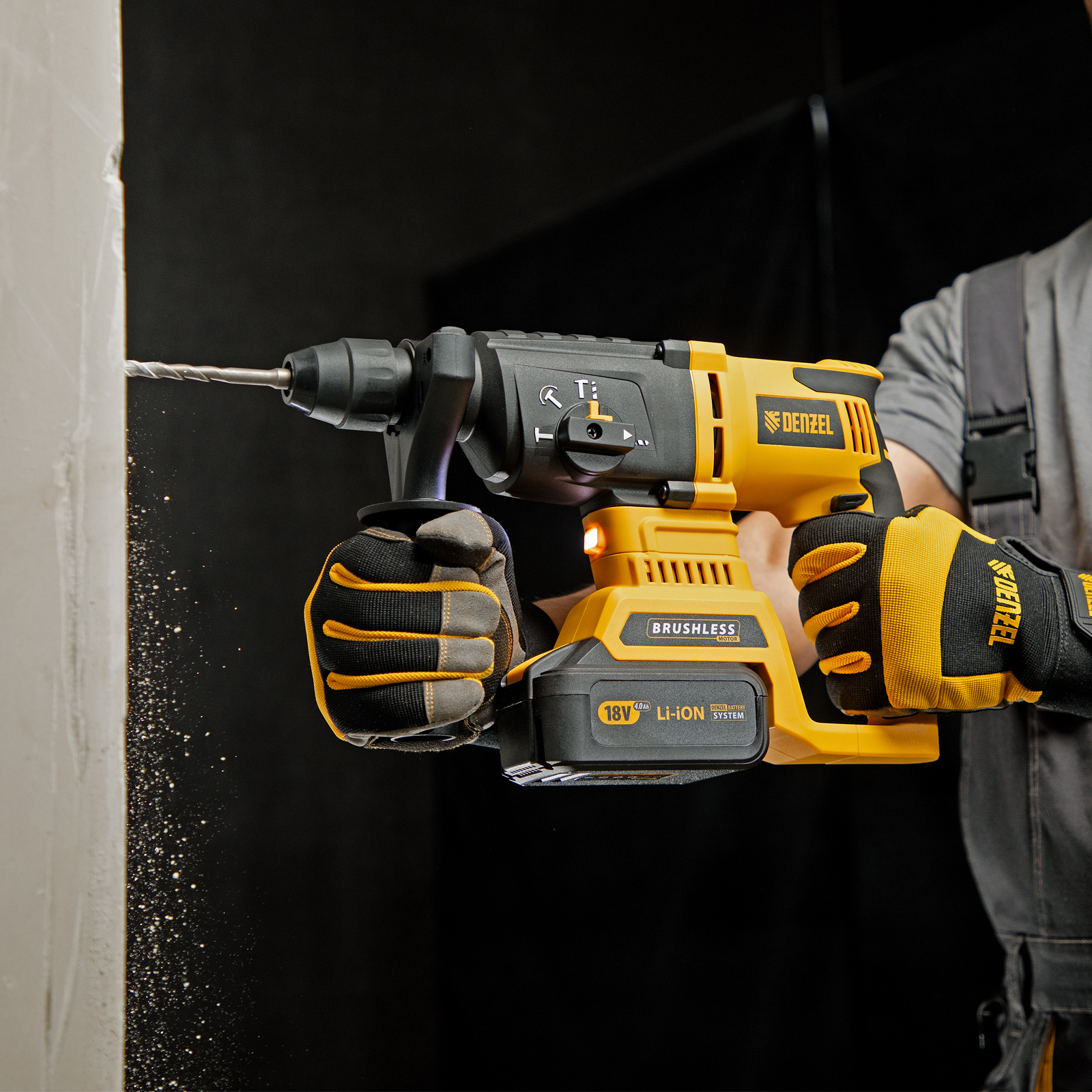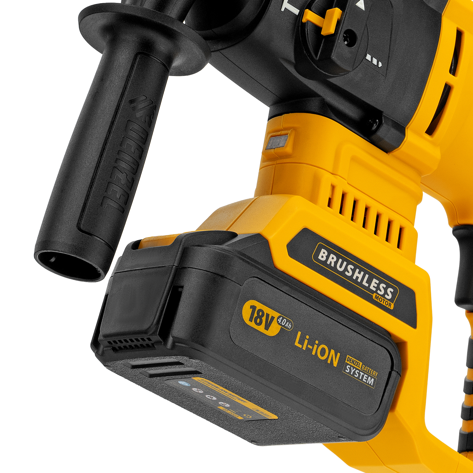 - Универсальный элемент питания — аккумулятор с интеллектуальной системой распознавания нагрузки совместим со всеми инструментами модельного ряда единой платформы Denzel Battery System 18V.