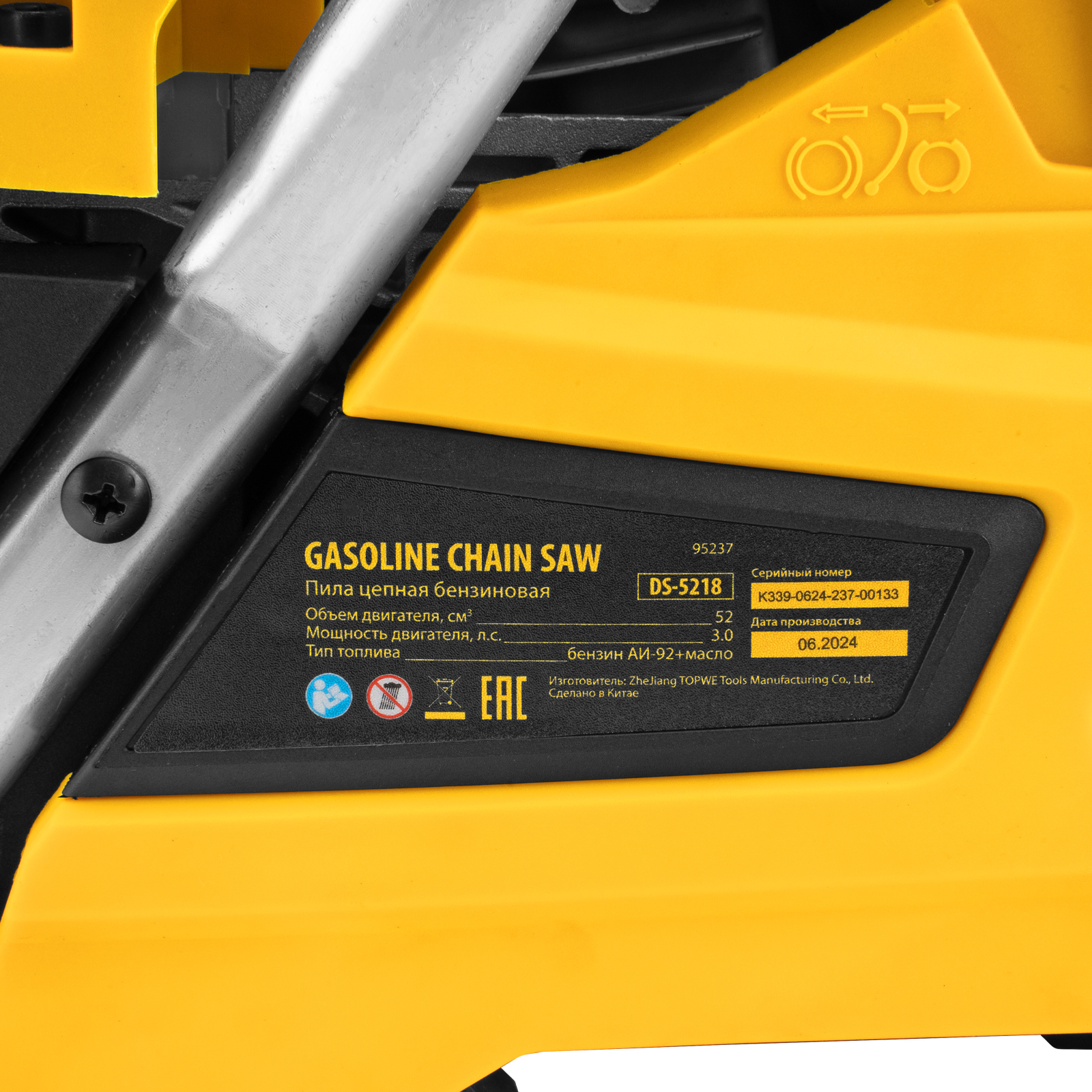 - Полный комплект поставки — инструменты для обслуживания, свечной ключ и емкость для приготовления топливной смеси прилагаются к пиле.