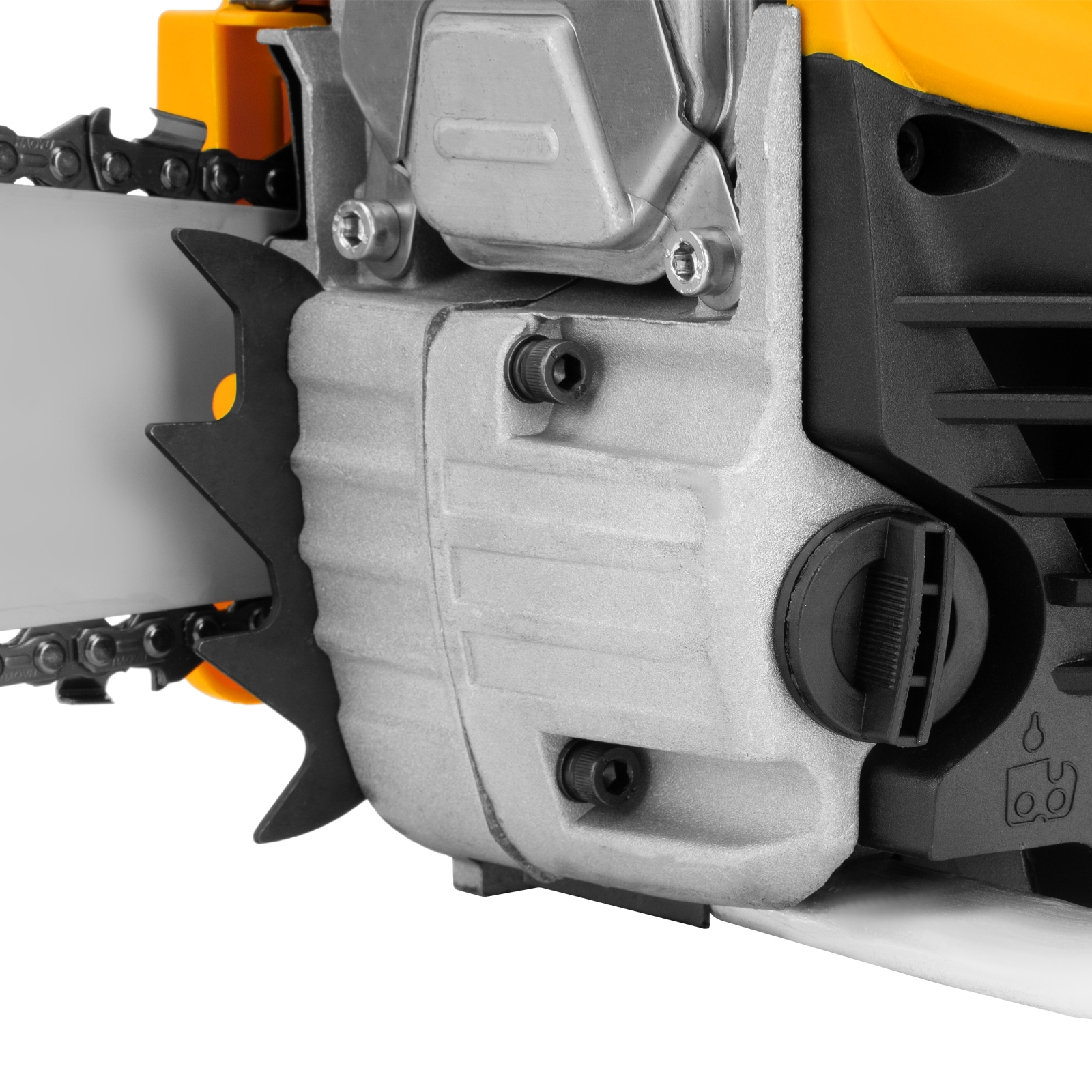 - Безопасная работа — блокировка от случайного запуска и моментальное срабатывание тормоза цепи при отскоке пилы снижают вероятность получения травм.