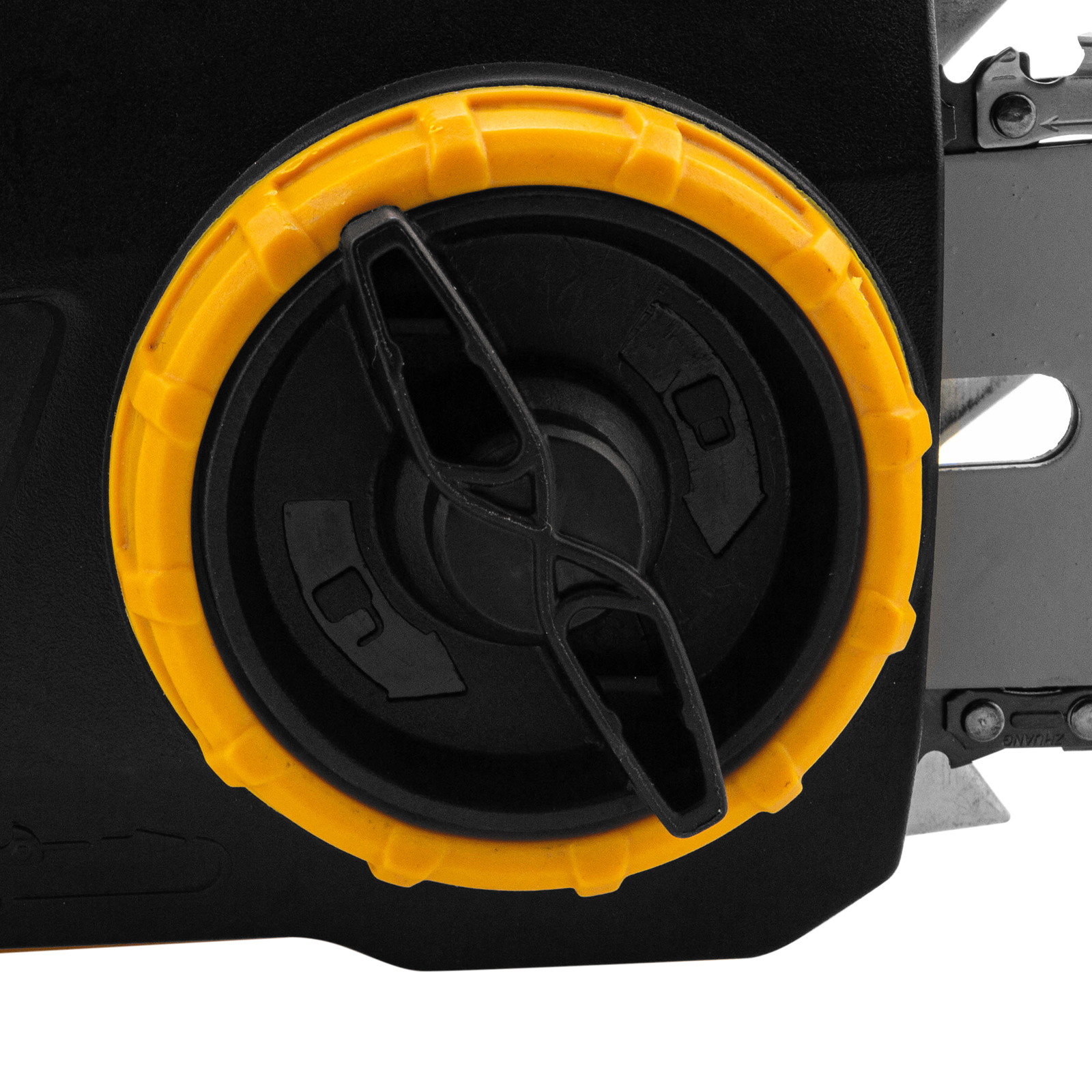 - Безопасная эксплуатация — блокировка пуска предотвращает случайное включение пилы, инерционный тормоз цепи мгновенно останавливает ее вращение при резком отскоке инструмента в сторону пользователя.