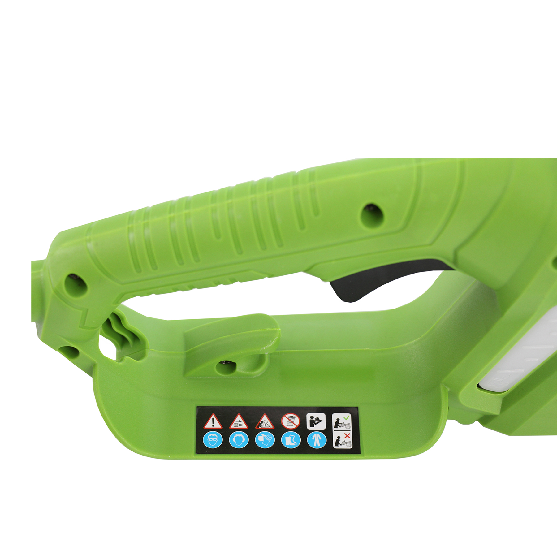 - Защита от случайного пуска — двигатель включается только при одновременном нажатии клавиши блокировки и выключателя.