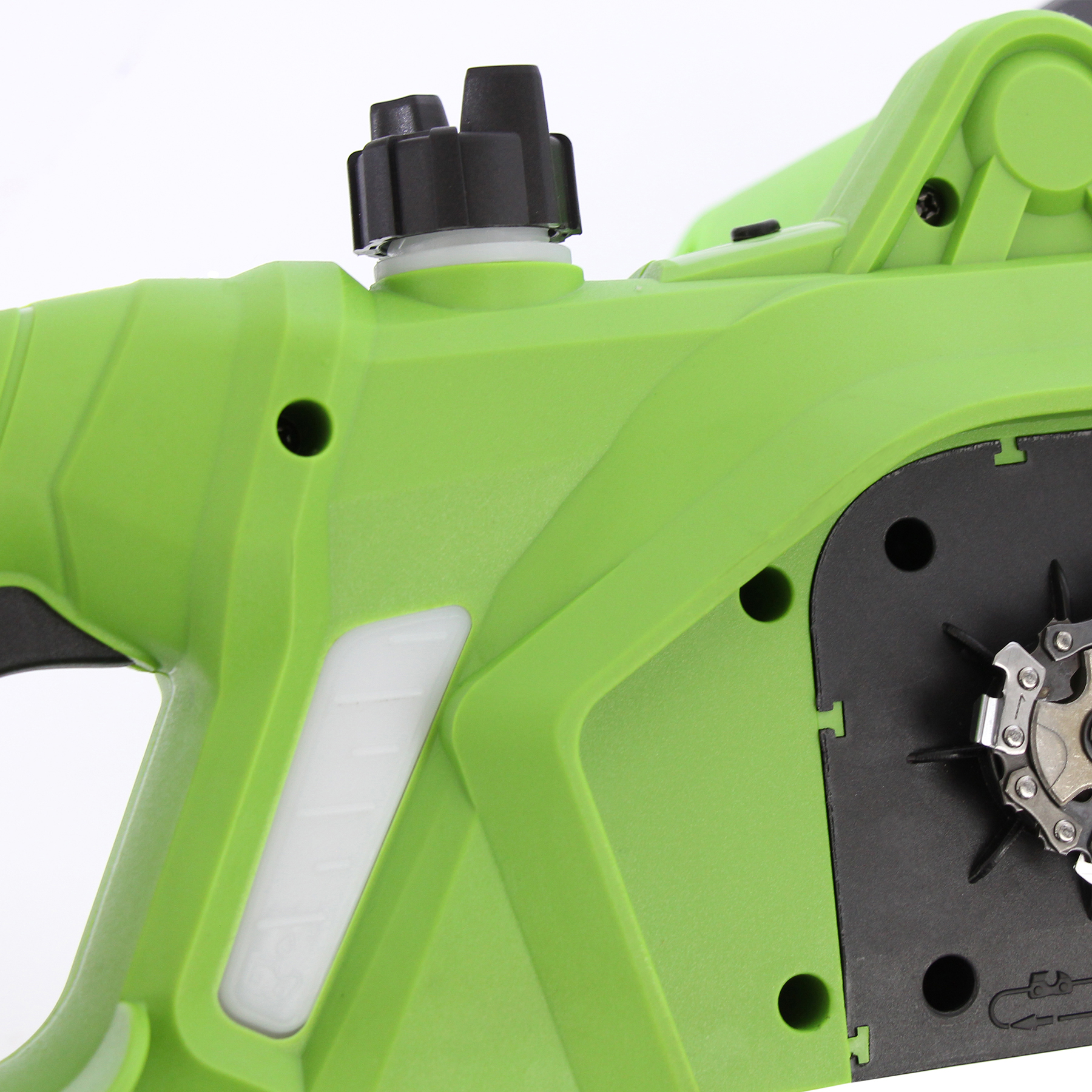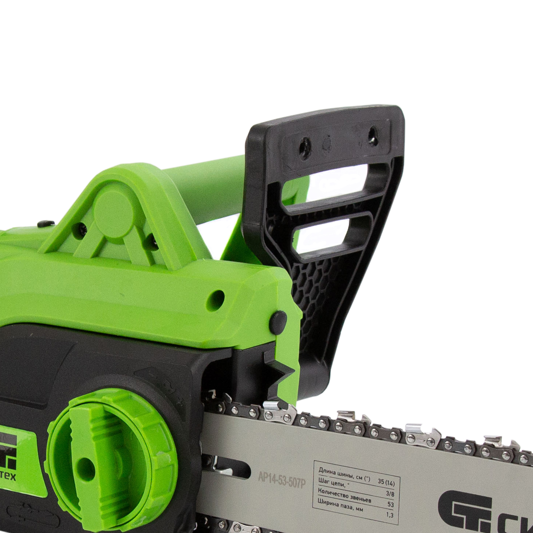 - Бесключевое натяжение цепи — регулировка осуществляется вручную при помощи винта на боковой части корпуса, использование инструментов не требуется.